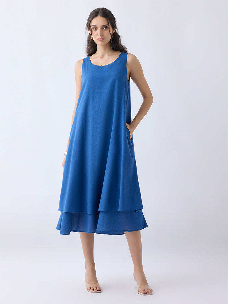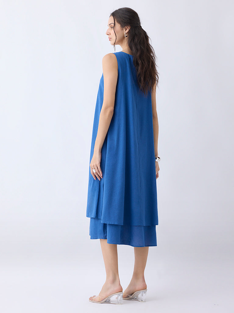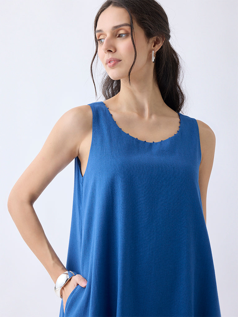 This indigo kurta from Utsa is designed in a flowing A-line shape. carrying a round neck and a sleeveless profile. Milled from pure-cotton fabric. it is finished with side pockets for a convenient detail. This ethnic piece offers an elegant addition for your everyday or traditional occasions.