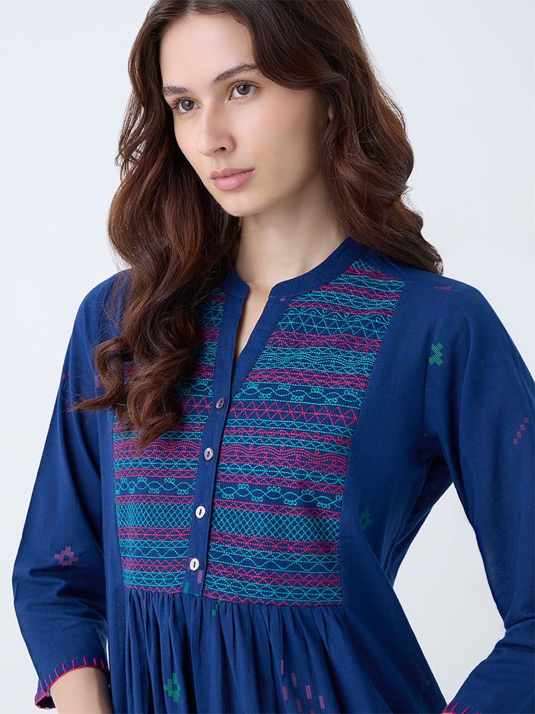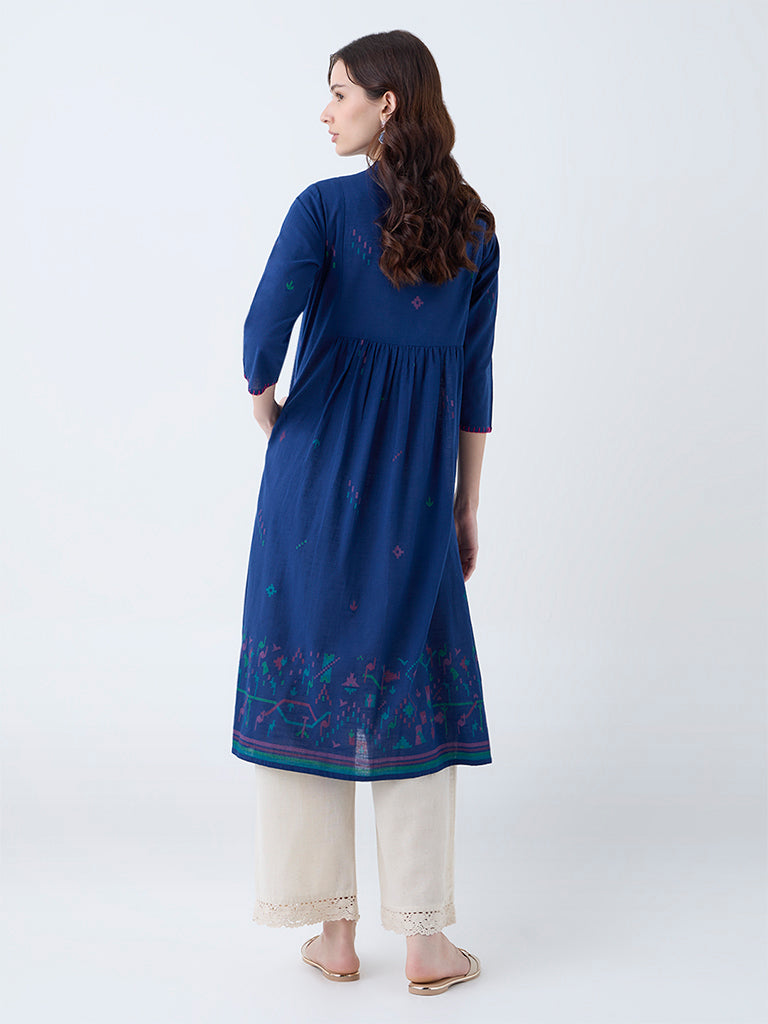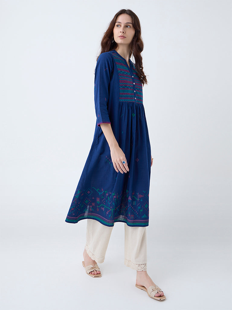Utsa Indigo Embroidered Cotton A-Line Kurta