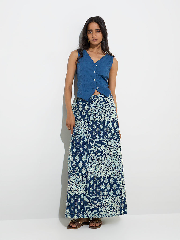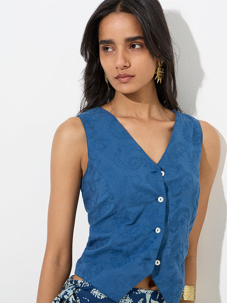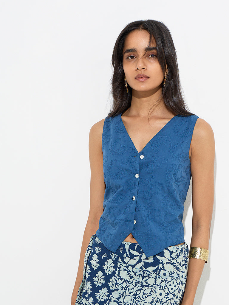 Add a touch of effortless elegance to your wardrobe with this indigo vest top from Utsa. Milled from pure cotton. it showcases intricate paisley embroidery that lends subtle texture and charm. The sleeveless silhouette is styled with a flattering V-neck and a button placket for easy wearability.