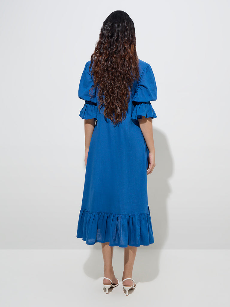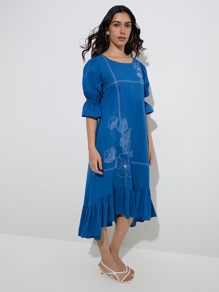 Utsa Indigo Embroidered Drop-Waist Cotton High-Low Dress