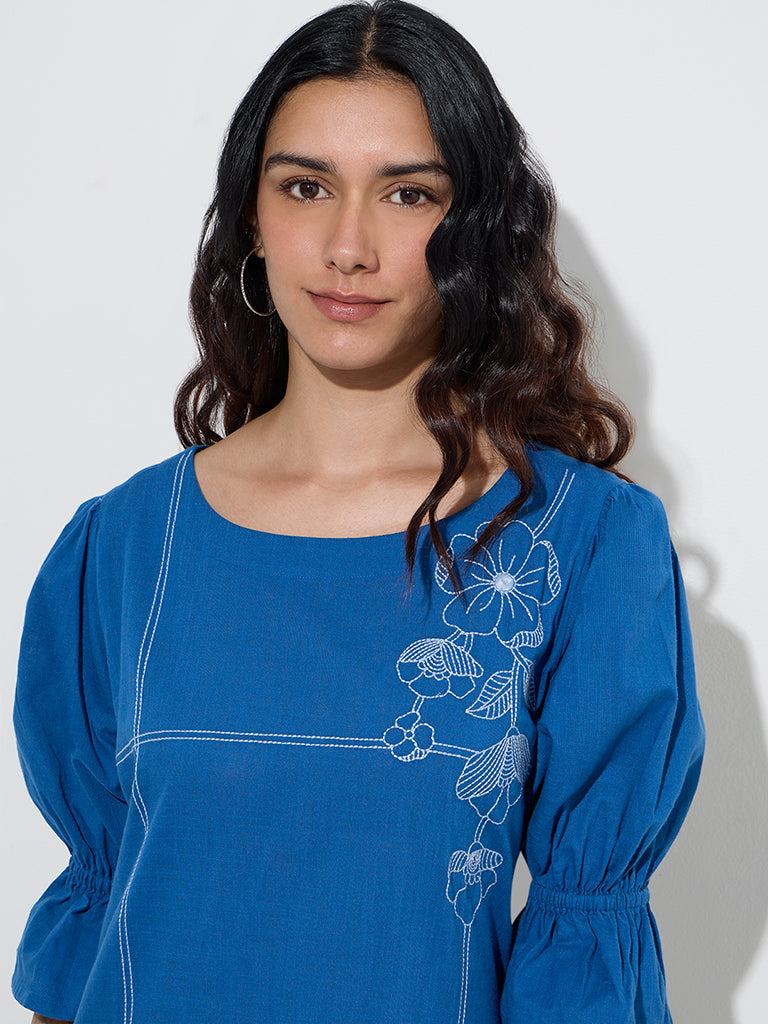 Utsa presents this indigo high-low dress. featuring floral embroidery on pure cotton. The drop-waist silhouette creates a relaxed. flowy fit. complemented by a round neck. puffed sleeves. and pleated hem detailing. Side pockets add a practical touch to its effortless charm.