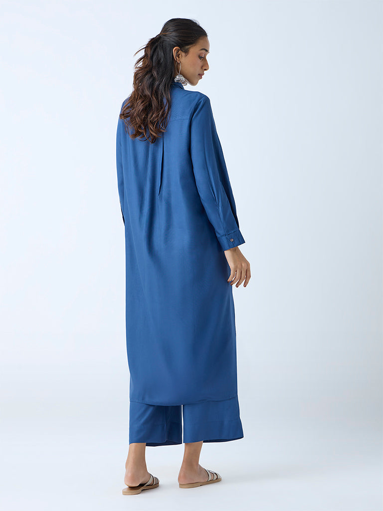 Sculpted in a flattering A-line silhouette. this indigo kurta from Utsa blends structure with elegance. Its breathable composition ensures elevated comfort. while the crisp collar. concealed button placket. and full sleeves add polish. Intricate floral embroidery lends a regal finish. making it a graceful pick for festive days and beyond.
