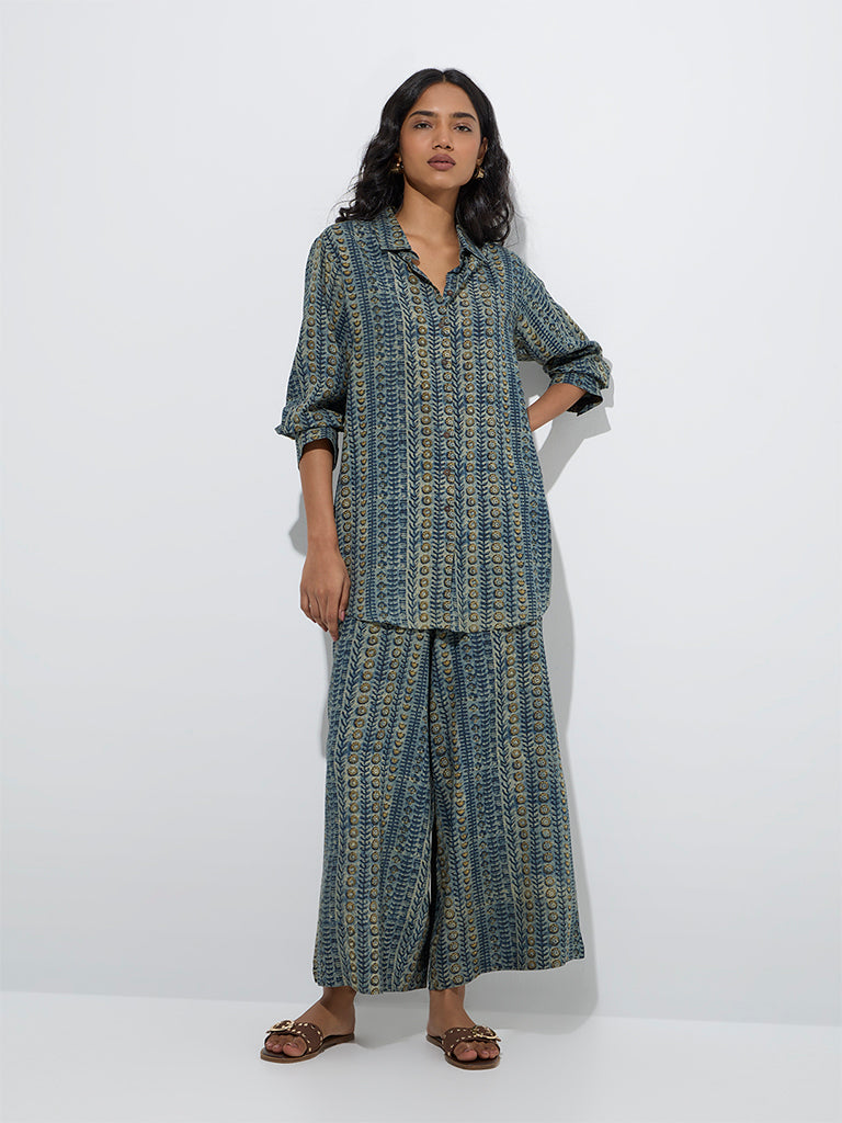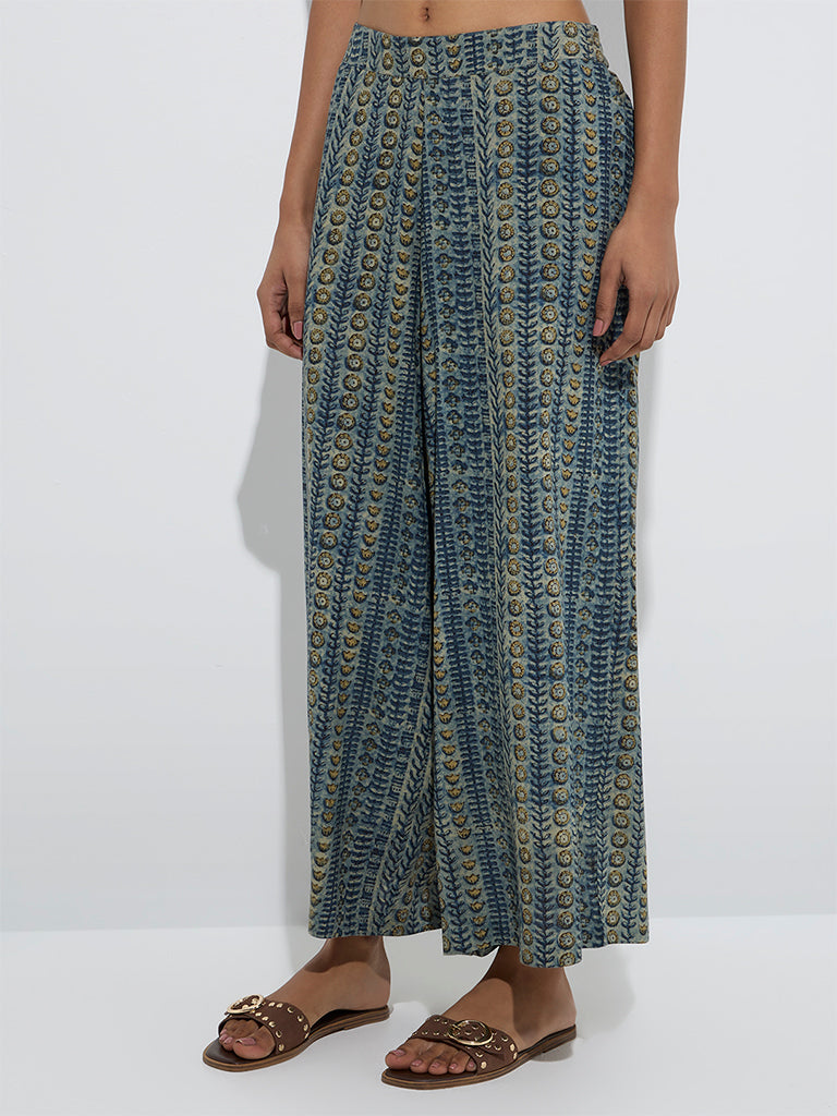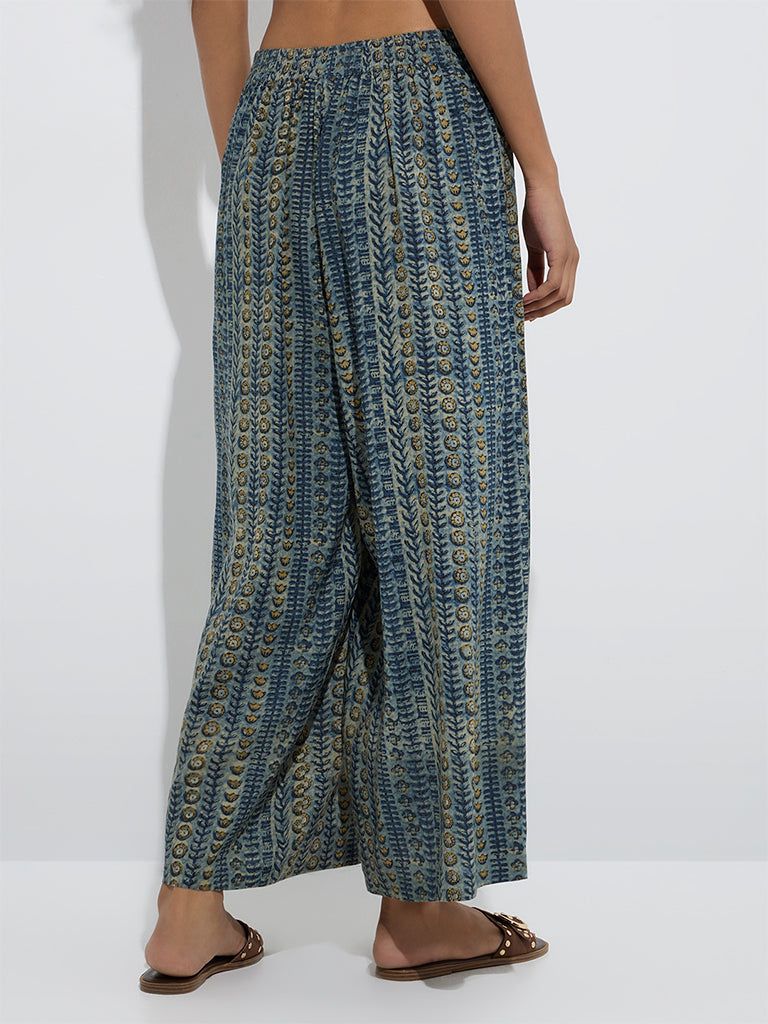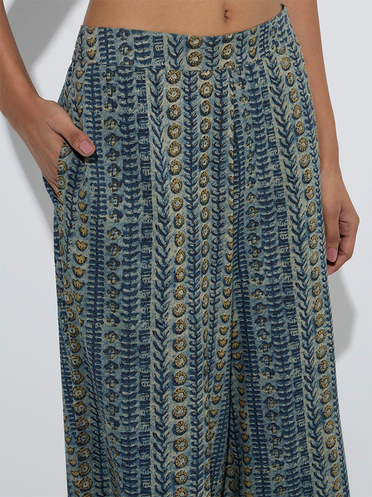 These indigo palazzos from Utsa are adorned with elegant foliage prints that add a touch of charm to your everyday style. Made from quality fabric. they are fitted with an elasticated waistband and side pockets for a comfortable and functional finish.