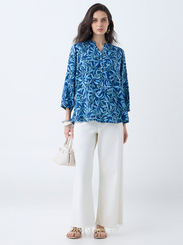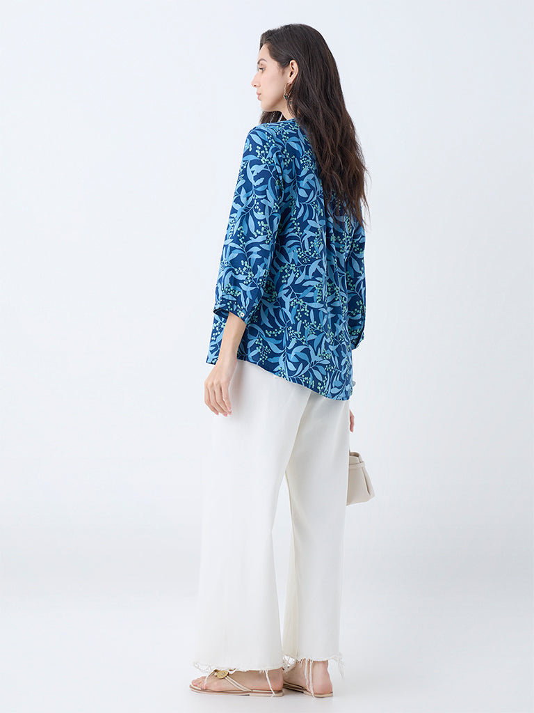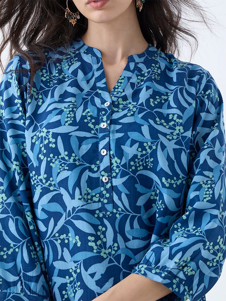 Refresh your ethnic assortment with this indigo tunic from Utsa. featuring charming leaf prints that lend a timeless appeal. Milled from breathable fabric for all-day ease. it is styled with a mandarin neck. a brief button placket. and three-quarter sleeves.
