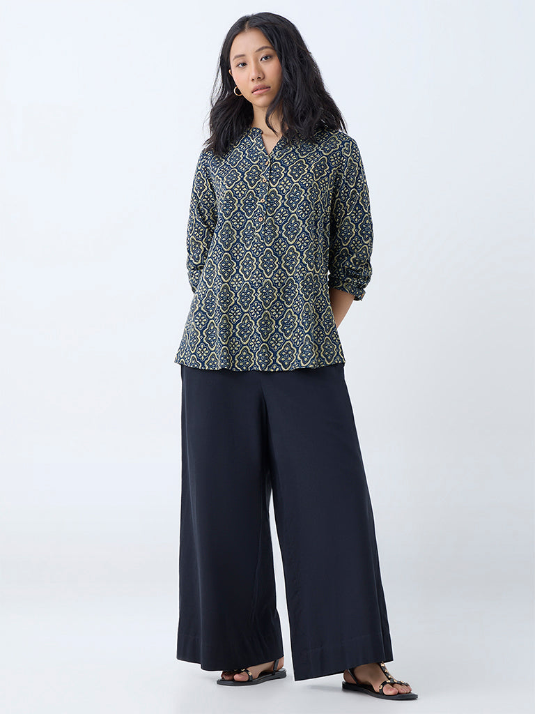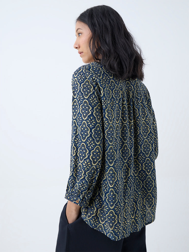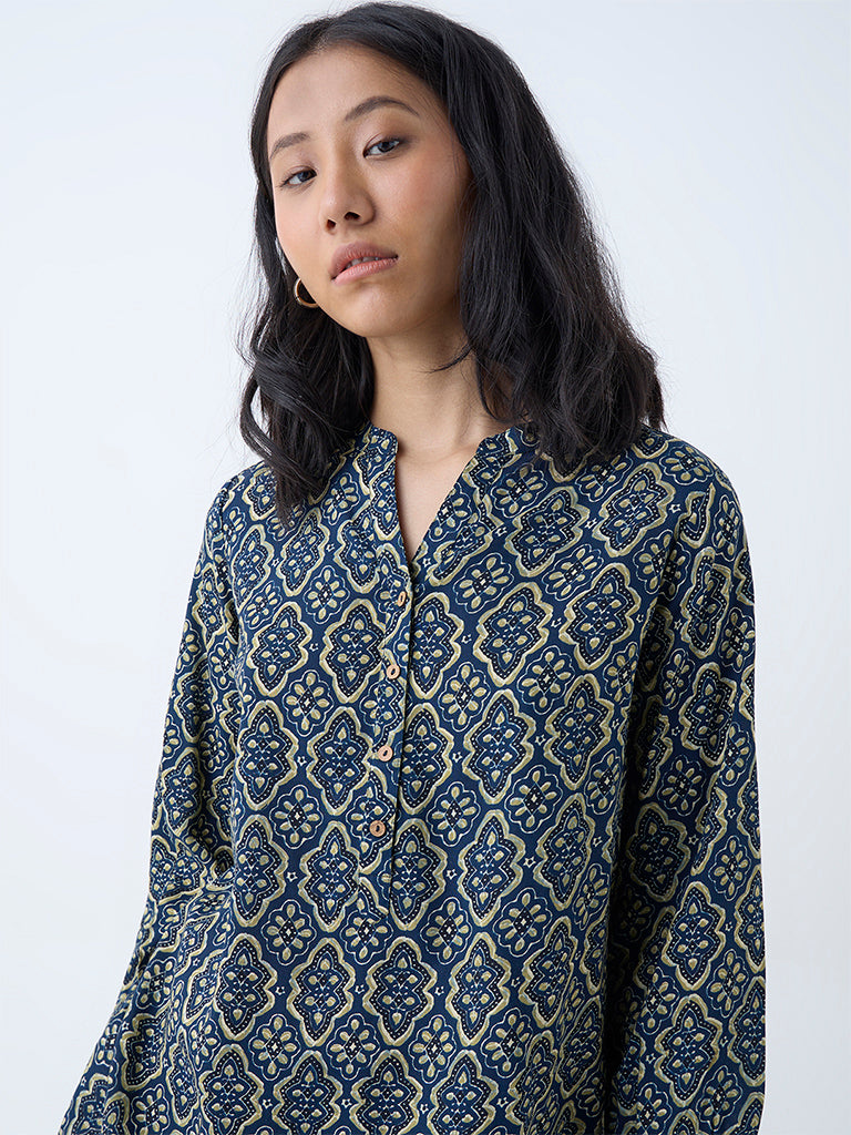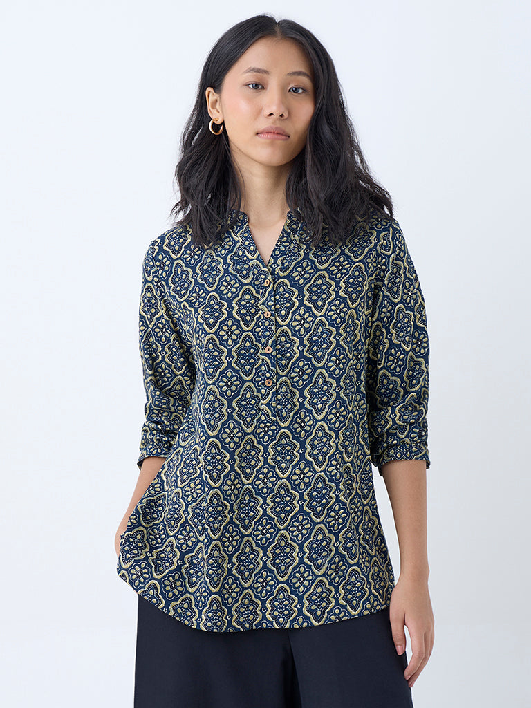 Utsa lends a touch of tradition to your outdoor edit with this indigo tunic. adorned with heritage-inspired prints. Tailored from a premium fabric for a structured feel. it’s styled with a mandarin neckline. a short button placket. and full sleeves.