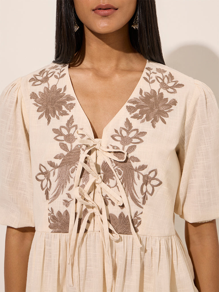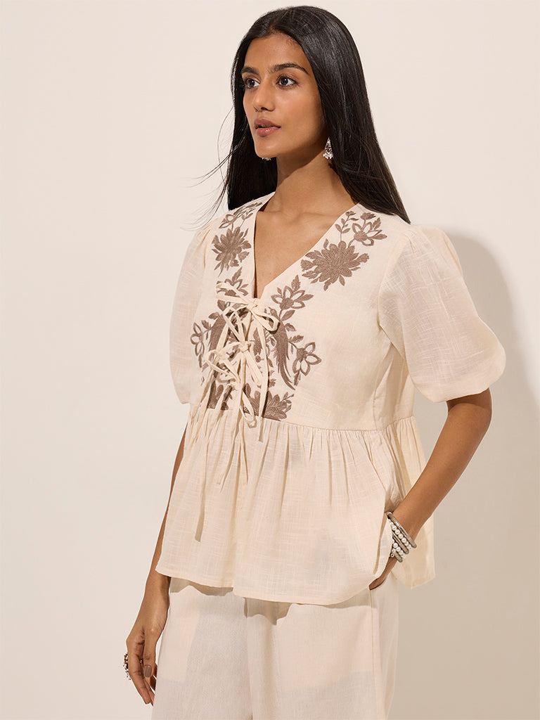 Utsa Ivory Floral Embroidered Knot-Detailed Cotton Top
