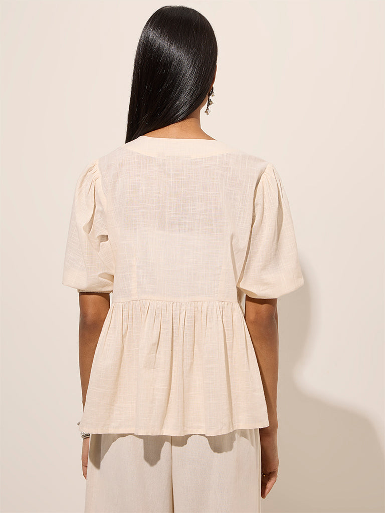Utsa presents this ivory top enhanced with floral embroidery in brown. Made with pure cotton. it flaunts a bunch of knot-detailing on the bodice that cascades down to elegant pleats. The V-neck and three-fourth puffed sleeves elevate the look of this top.