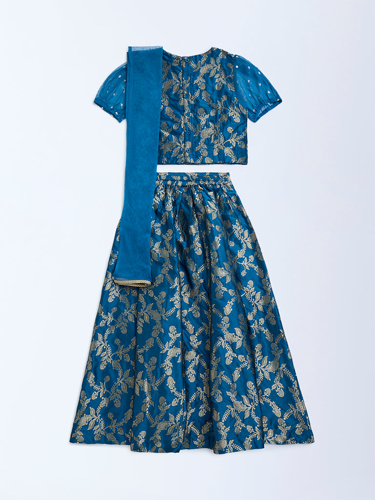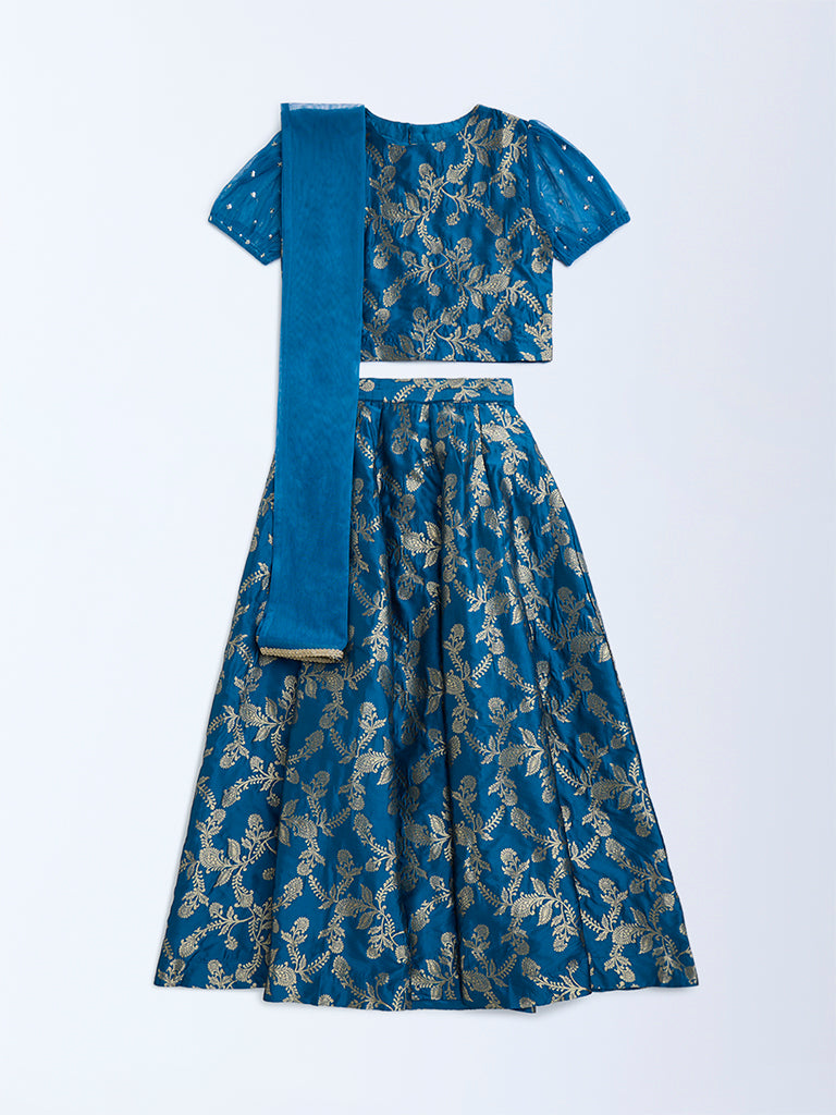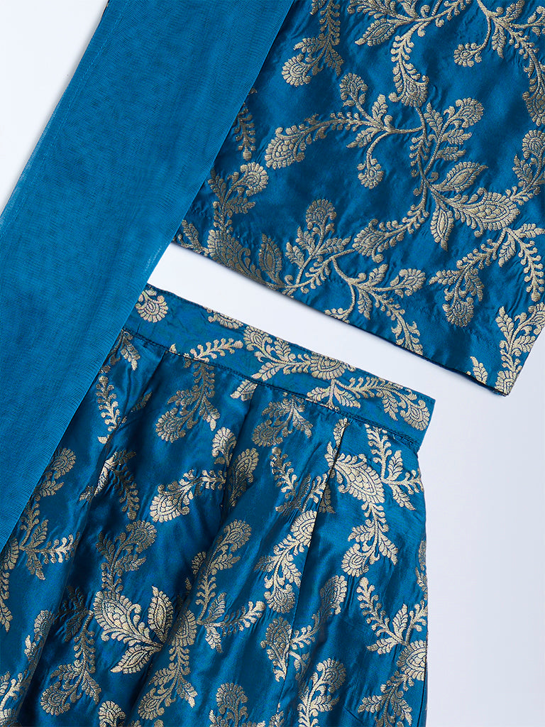 A festive favourite in the making. this blue ethnic set from Utsa Kids is woven with all-over embroidery for a touch of tradition with playful ease. The choli features a round neck and puff sleeves that add a sweet flair. while the matching ghagra is fitted with an elasticated waistband to keep comfort at the core. Finished with a net dupatta trimmed in zari. it’s perfect for little celebrations and big family moments alike.