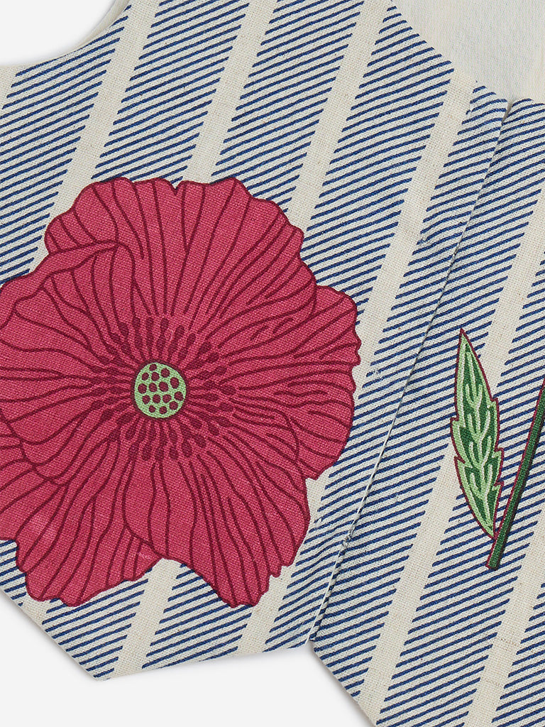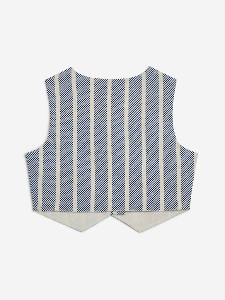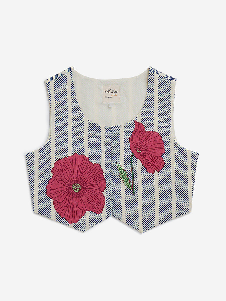 Utsa Kids launches this blue top adorned with stripes and floral prints. The soft and breathable fabric garment carries a round neck leading to a concealed button placket and sleeveless cut.