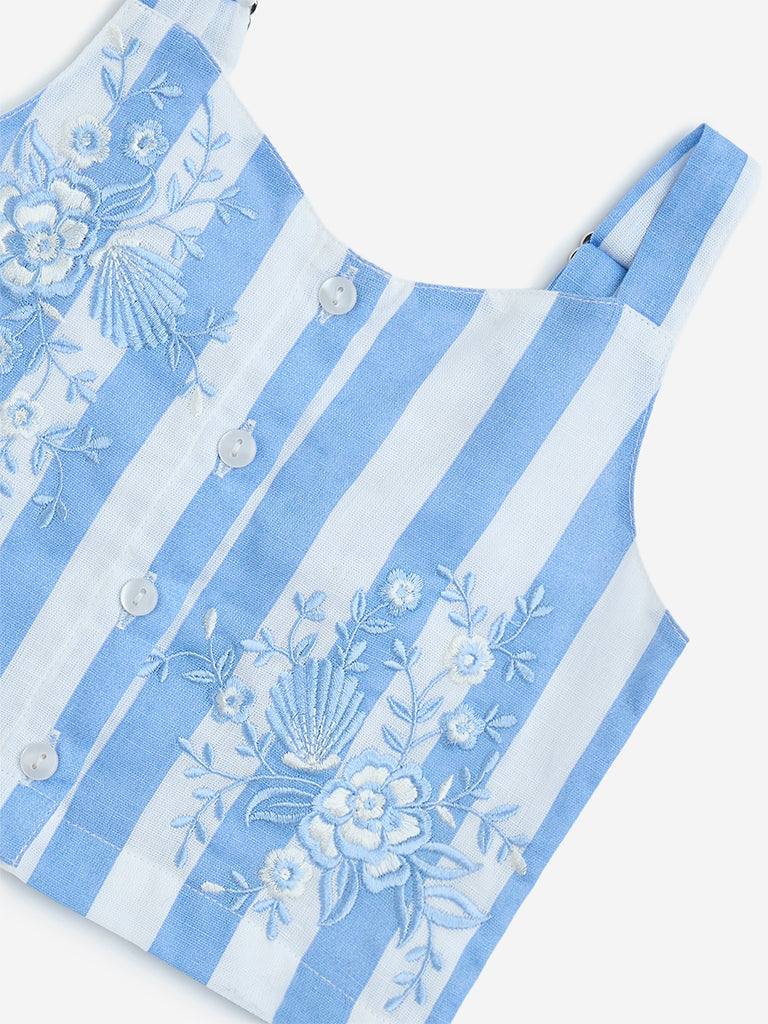 This blue ethnic top from Utsa Kids is constructed from a breezy cotton-linen blend and showcases floral embroidery over a striped base. Designed with a V-neck and adjustable shoulder straps. it’s finished with a smocked back to offer a secure fit.