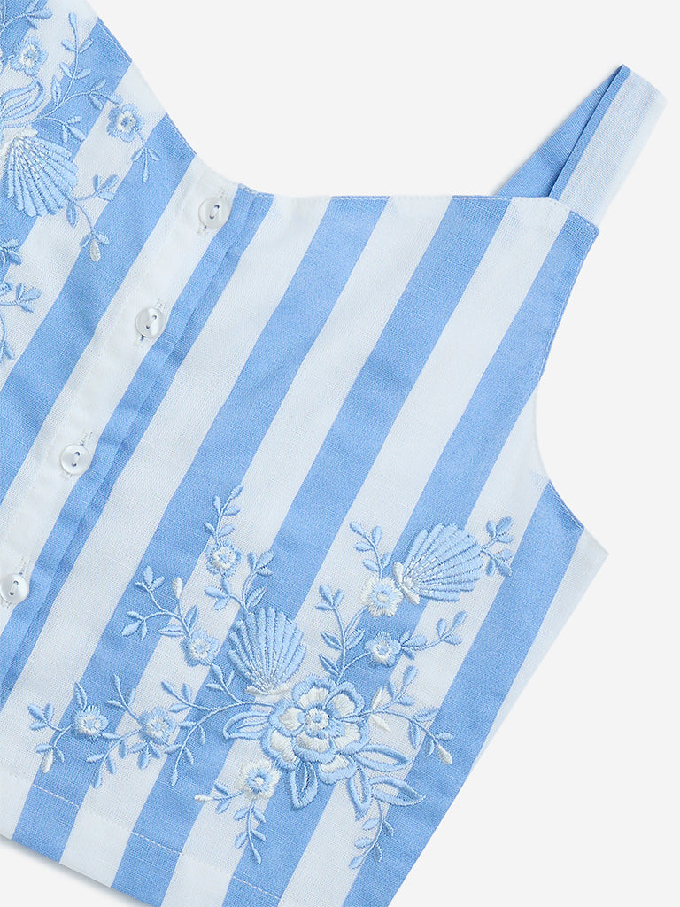 This blue ethnic top from Utsa Kids is constructed from a breezy cotton-linen blend and showcases floral embroidery over a striped base. Designed with a V-neck and adjustable shoulder straps. it’s finished with a smocked back to offer a secure fit.