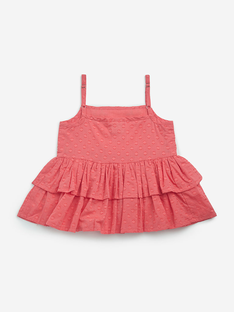 Brighten up your little one’s wardrobe with this coral top from Utsa Kids. Milled from a premium cotton-blend fabric. it features a floral embroidered bodice and playful Swiss dot prints all over. The tiered ruffle detail at the bottom adds a charming touch. while the square neck and adjustable shoulder straps ensure a comfortable fit.
