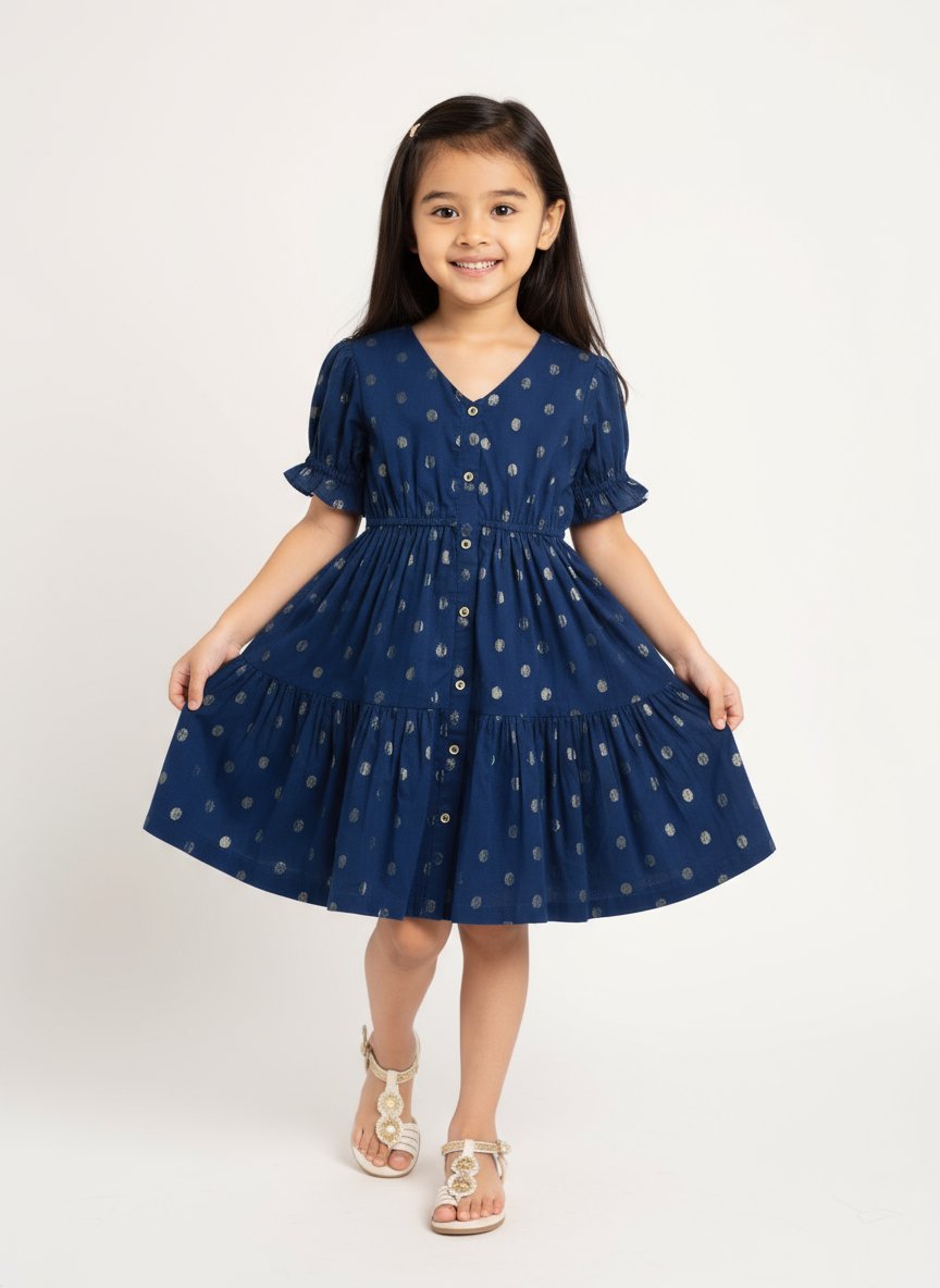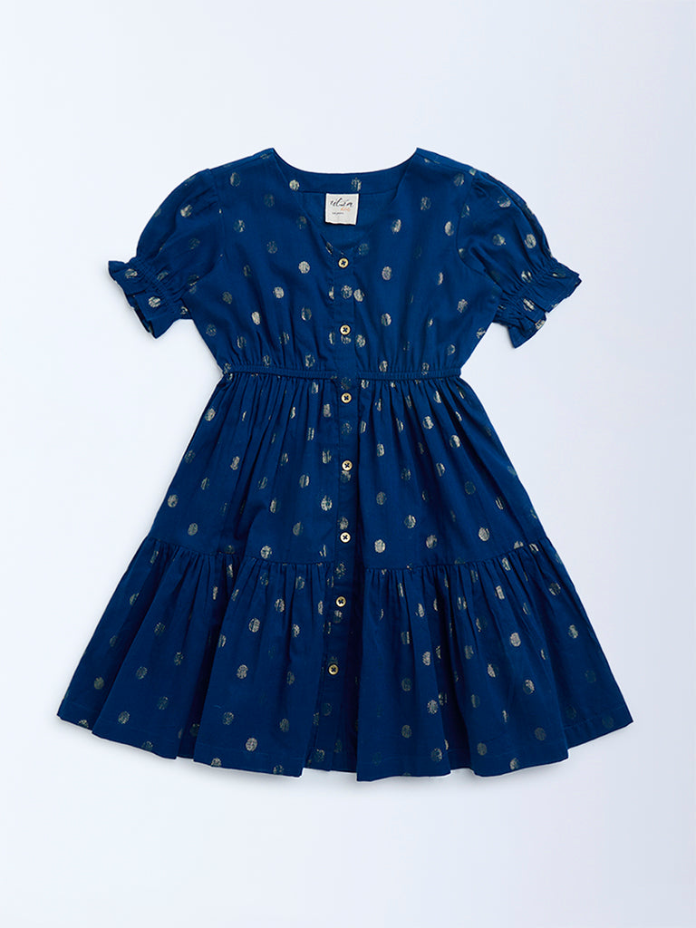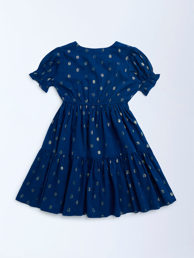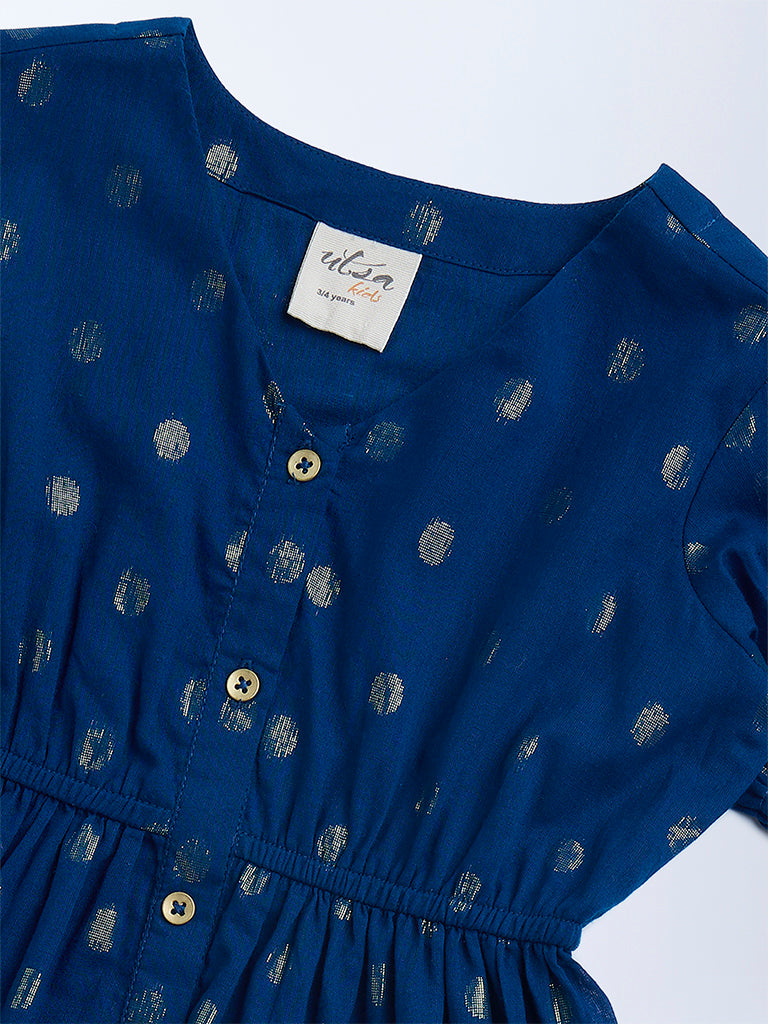 Utsa Kids Dark Blue Badla Pattern Fit-and-Flare Cotton-Blend Dress – (2-8yrs)