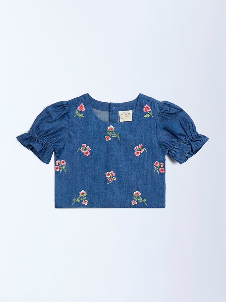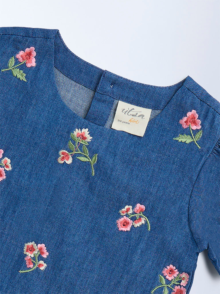 Utsa Kids Dark Blue Floral Embroidered Denim Ethnic Top – (2-8yrs)