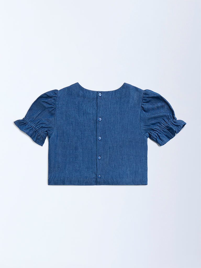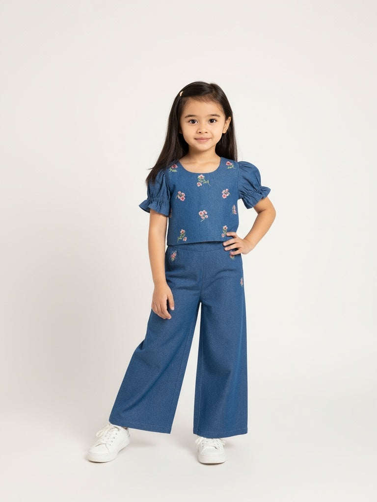 Let your little angel twirl into celebrations with this dark blue denim top from Utsa Kids. Adorned with exquisite floral embroidery. it adds a playful yet stylish touch to any festive outfit. Finished with a round neck and puffed sleeves. this top keeps little ones comfortable while stealing the spotlight at every occasion.