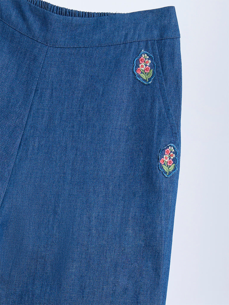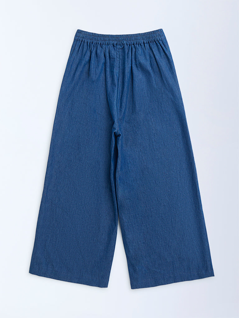 Utsa Kids Dark Blue Floral Embroidered Denim Palazzos – (8-14yrs)