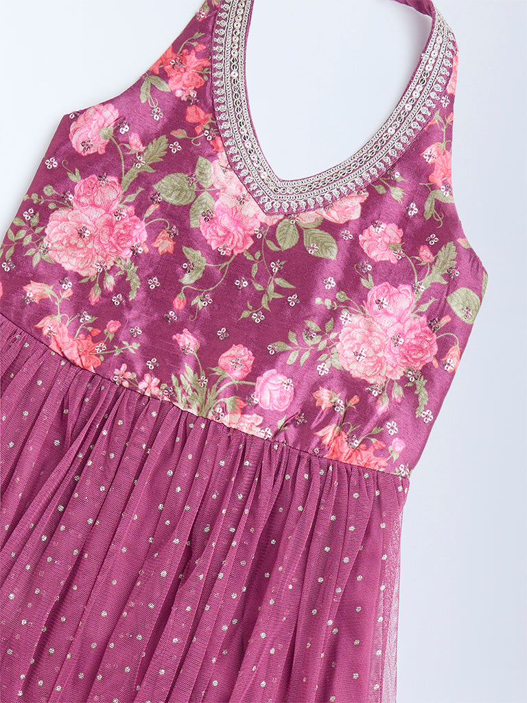 Utsa Kids captures festive grace with this dusty rose badla-printed dress crafted in a flowing A-line silhouette. The bodice features delicate floral motifs with bead accents tracing the halter neckline. while the mesh overlay adds soft shimmer and movement. Lightweight and airy. it’s a perfect pick for celebrations that call for effortless elegance.
