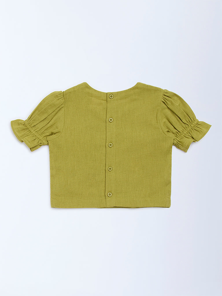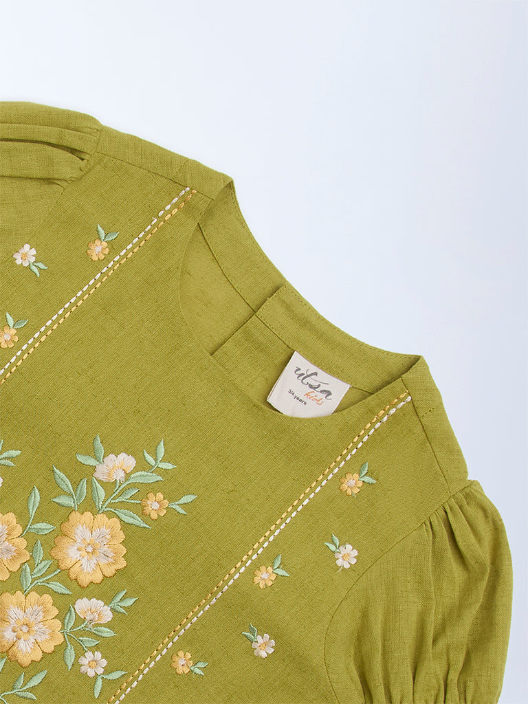 Utsa Kids Green Floral Embroidered Cotton-Blend Top – (2-8yrs)