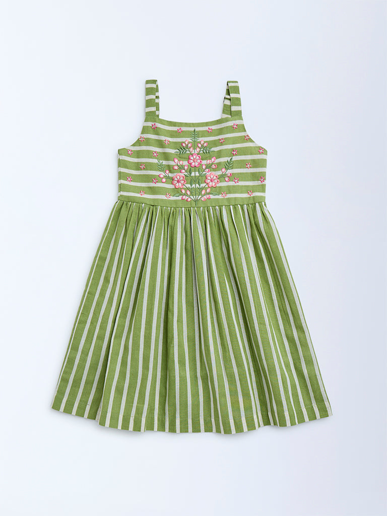 Utsa Kids Green Stripe Printed Cotton A-Line Dress – (2-8yrs)