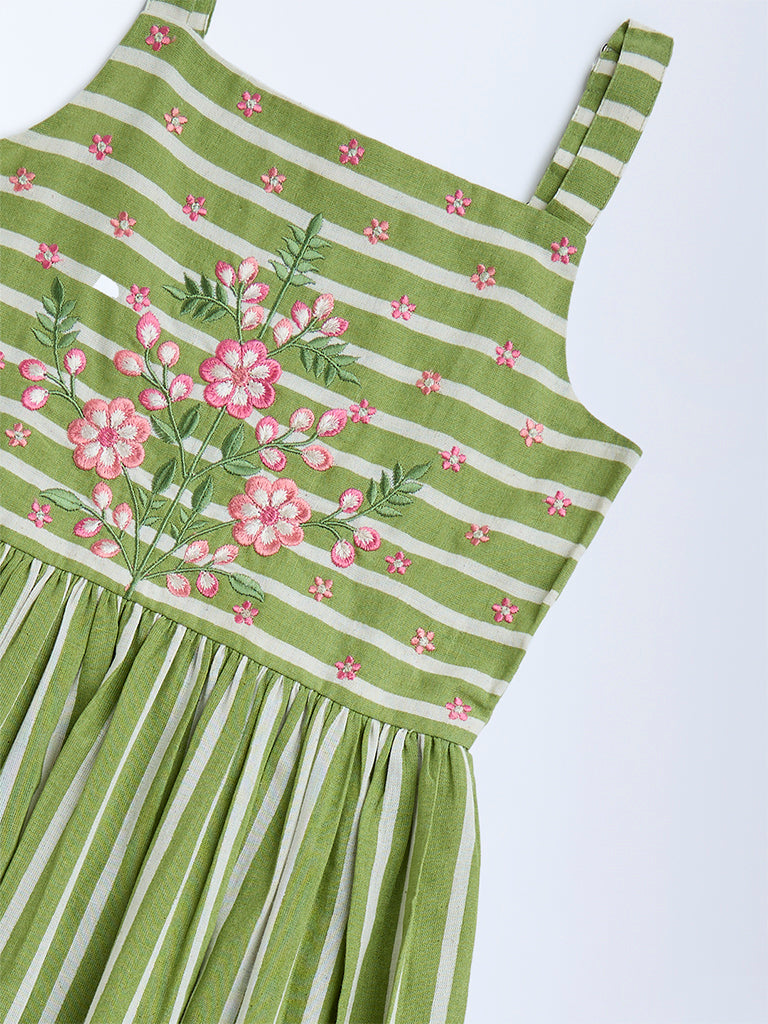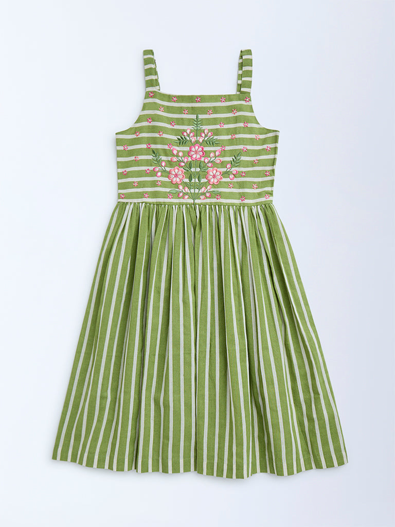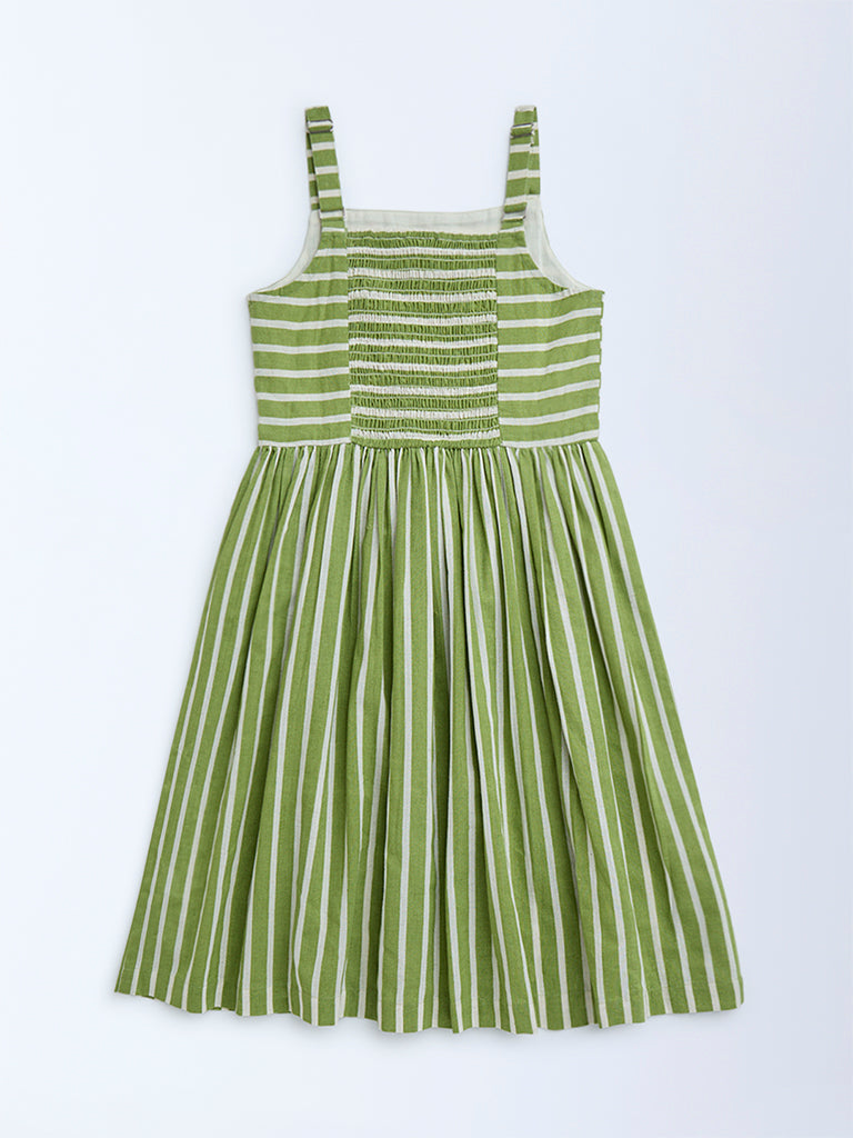 Utsa Kids Green Stripe Printed Cotton A-Line Dress – (8-14yrs)