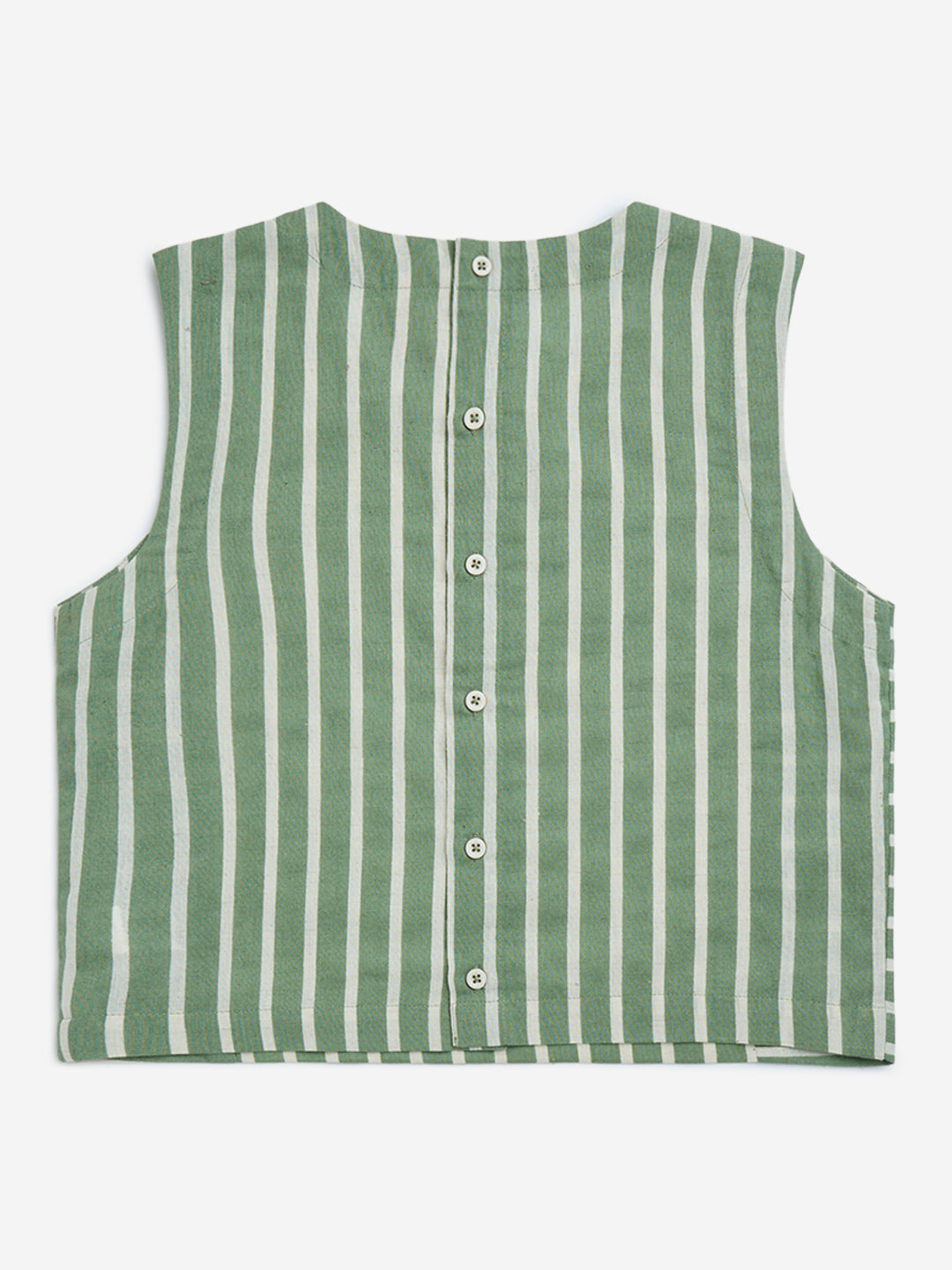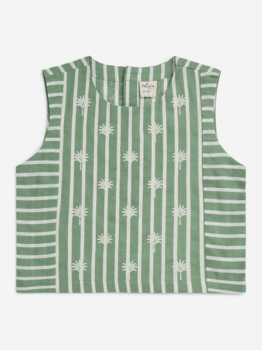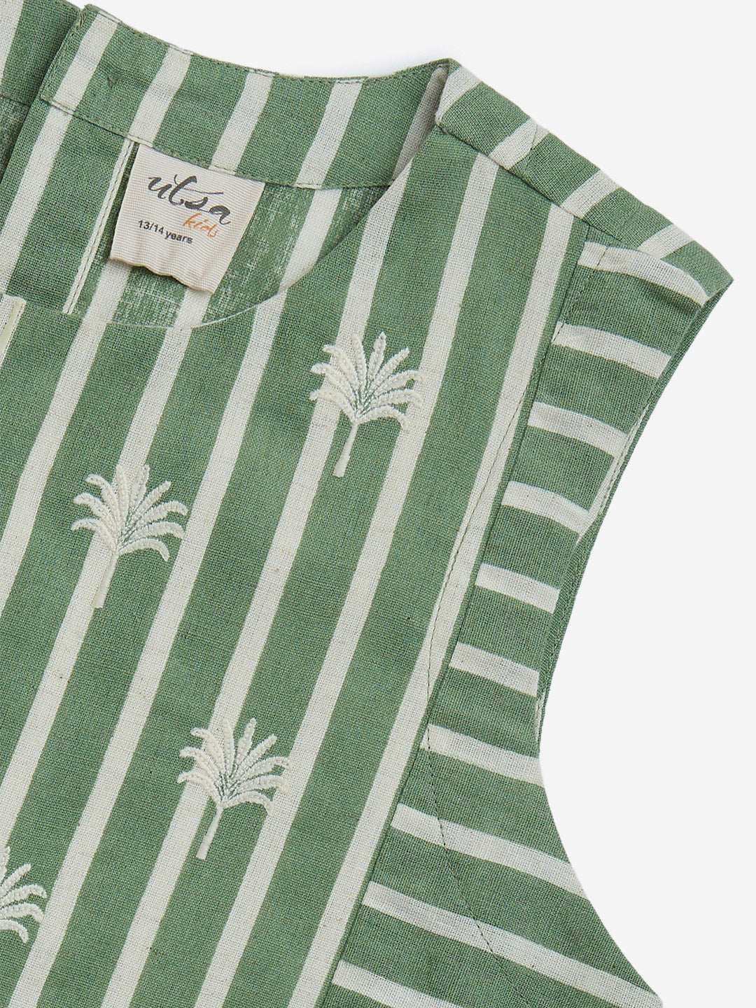 This green ethnic top from Utsa Kids is constructed from a snug cotton-linen blend for all-day comfort. Showcasing floral embroidery over a striped base. it features a round neck and sleeveless cut. while a button closure at the back ensures easy wear.
