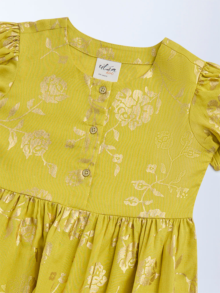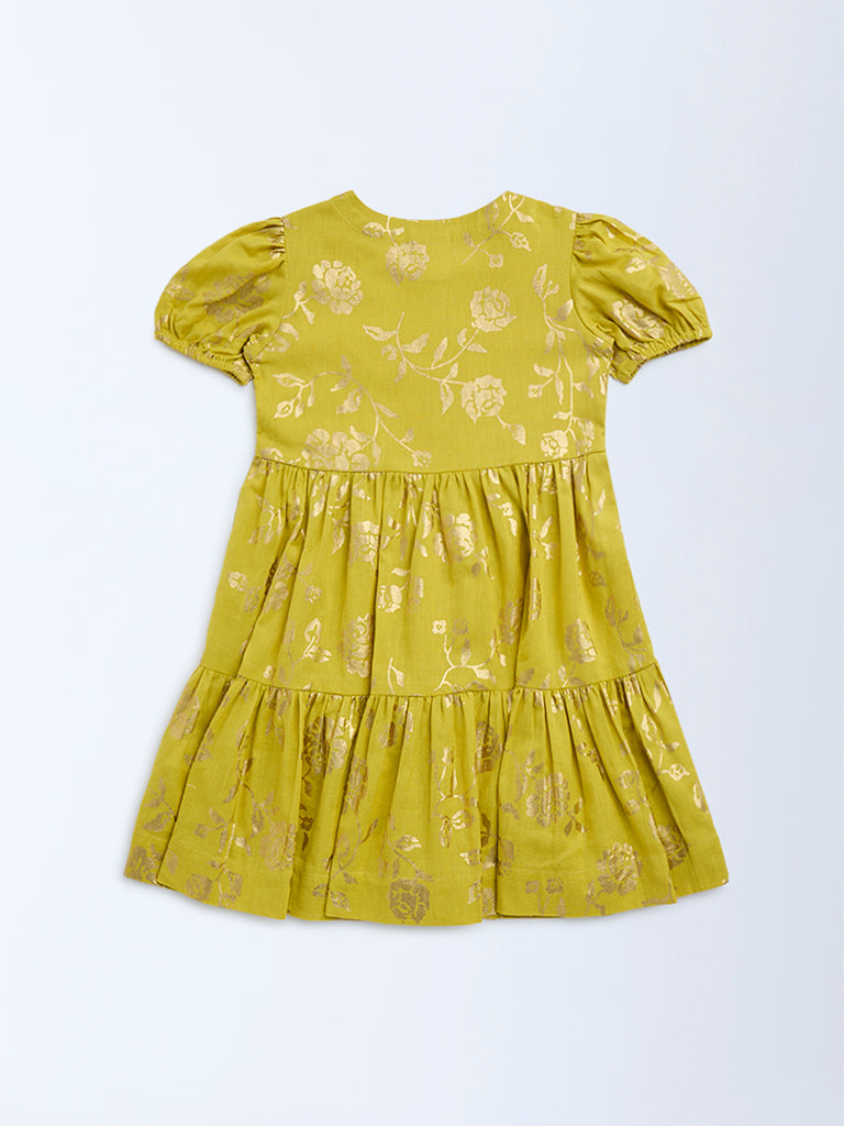 Utsa Kids Lime Floral Pattern Tiered Cotton-Blend Dress – (2-8yrs)