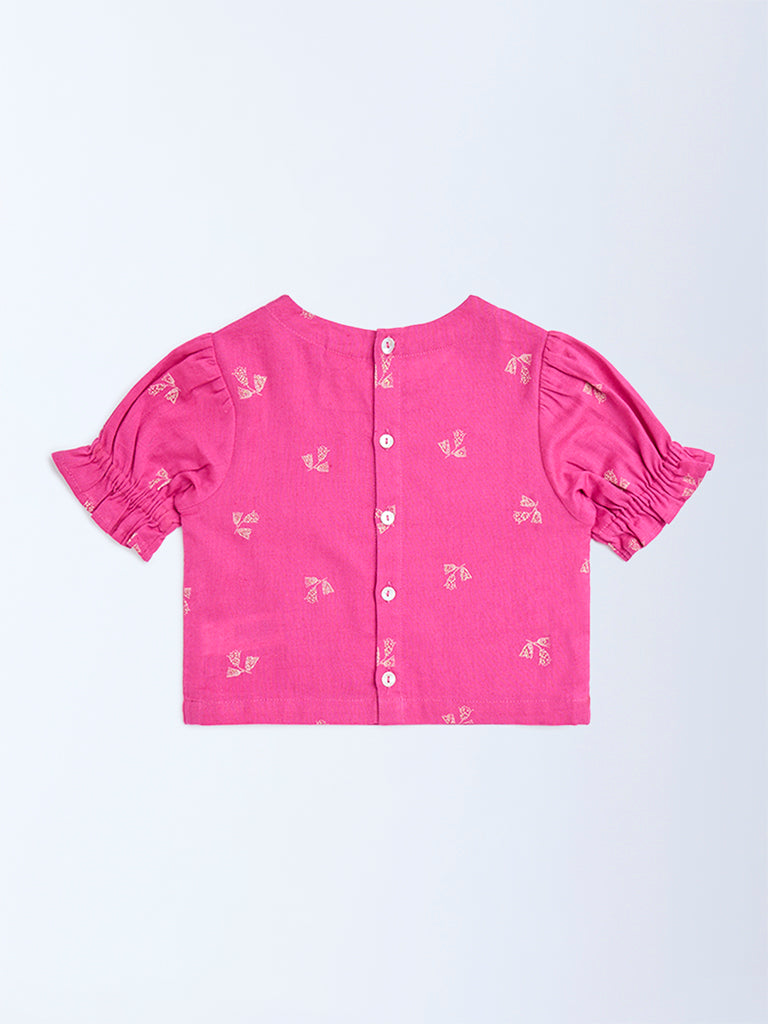 Playful yet elegant. this magenta top from Utsa Kids is decorated with dainty floral motifs that bring a festive sparkle to any celebration. Made from a smooth cotton-blend fabric. it features a classic round neck and puff sleeves for a touch of sweetness. The button placket at the back ensures easy. fuss-free dressing.