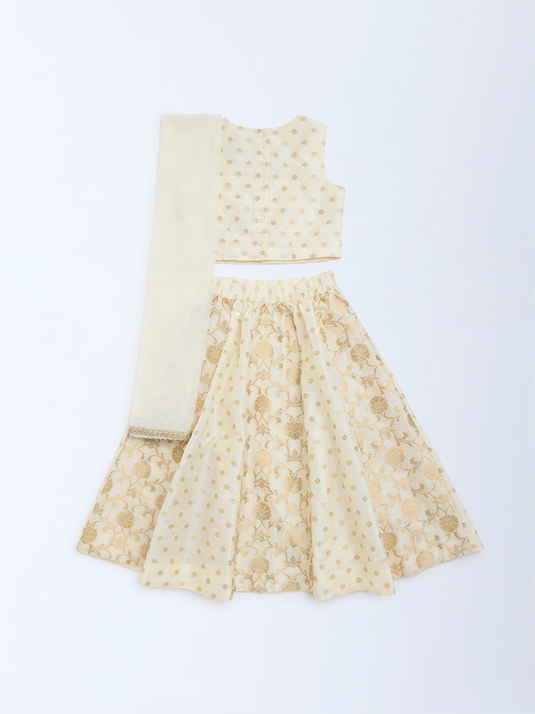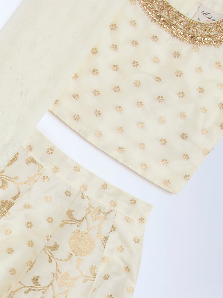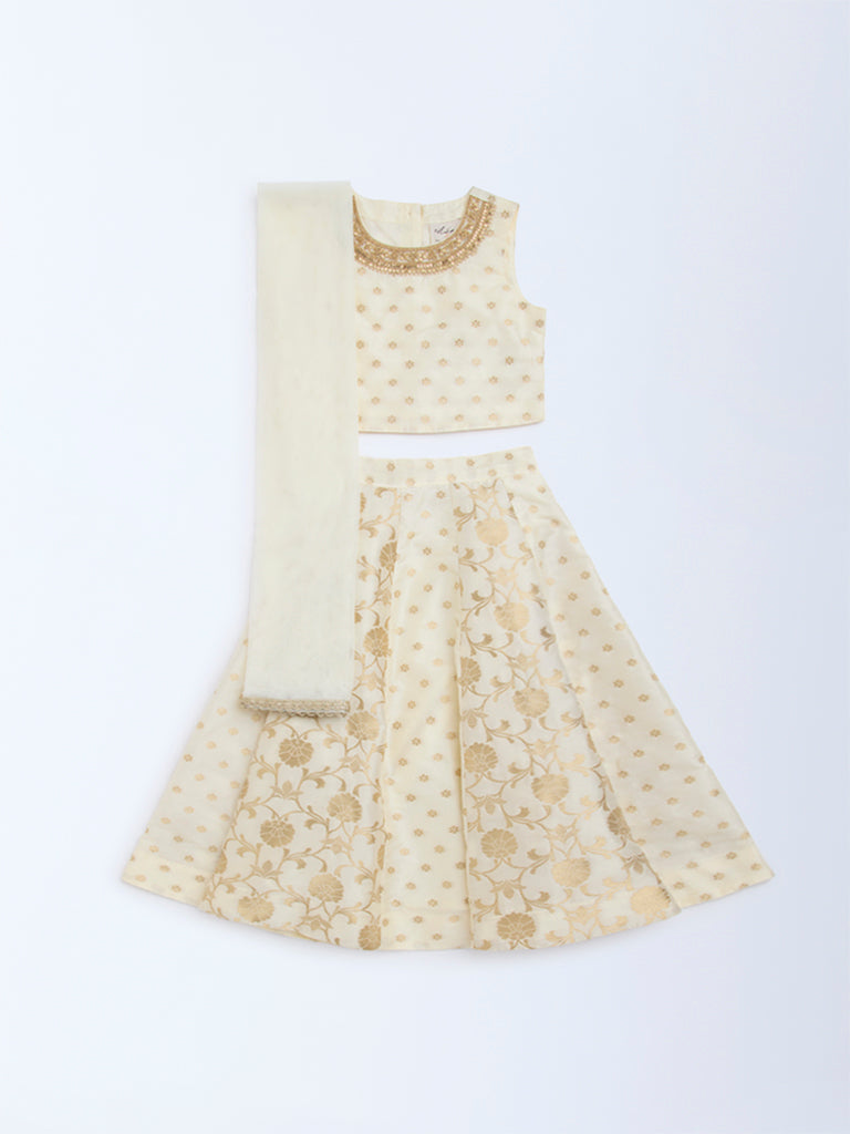 Make celebrations extra special with this off-white set from Utsa Kids. The sleeveless choli sparkles with delicate floral motifs and ornate embroidery round the neckline. adding a festive flourish. Paired with a golden-toned floral ghagra and a soft dupatta edged in zari. the ensemble is made for twirls. laughter. and all-day comfort. A joyful look for little ones to shine in every occasion.