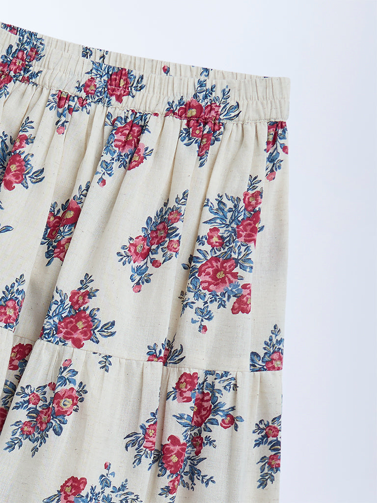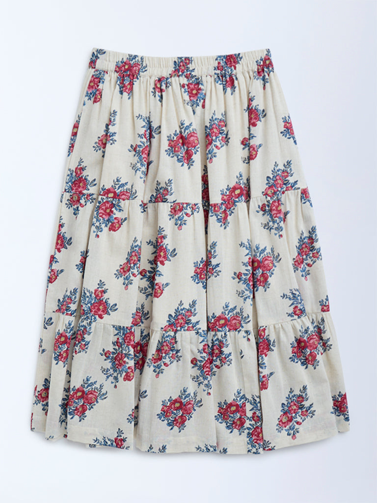 Utsa Kids Off-White Floral Tiered Cotton-Blend Skirt – (8-14yrs)