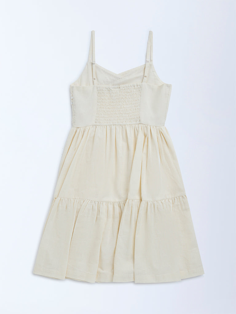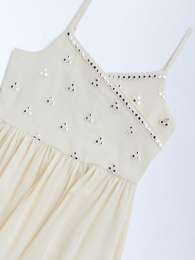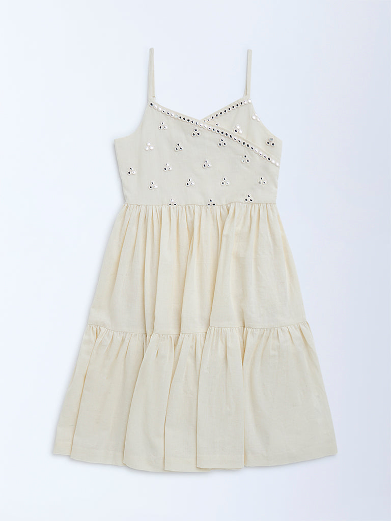 Utsa Kids Off-White Mirror-Work Detailed Cotton Tiered Dress – (8-14yrs)