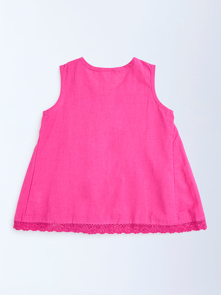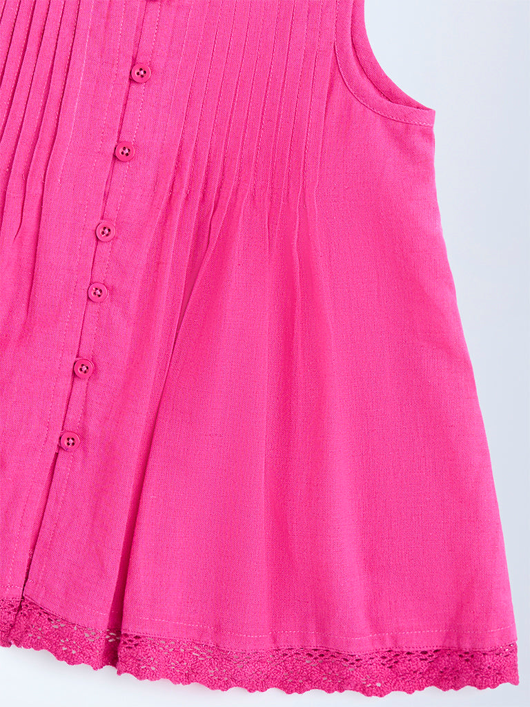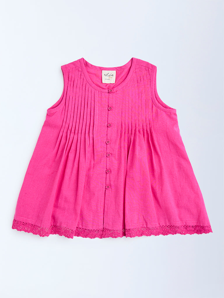 Utsa Kids adds a touch of handcrafted charm to casual dressing with this pink lace-trimmed dress. Designed with a round neck and a button placket. it flaunts delicate pintuck detailing and a scalloped lace hem for a graceful finish. Crafted from a soft cotton-blend fabric. it promises comfort and ease for playful. all-day wear.