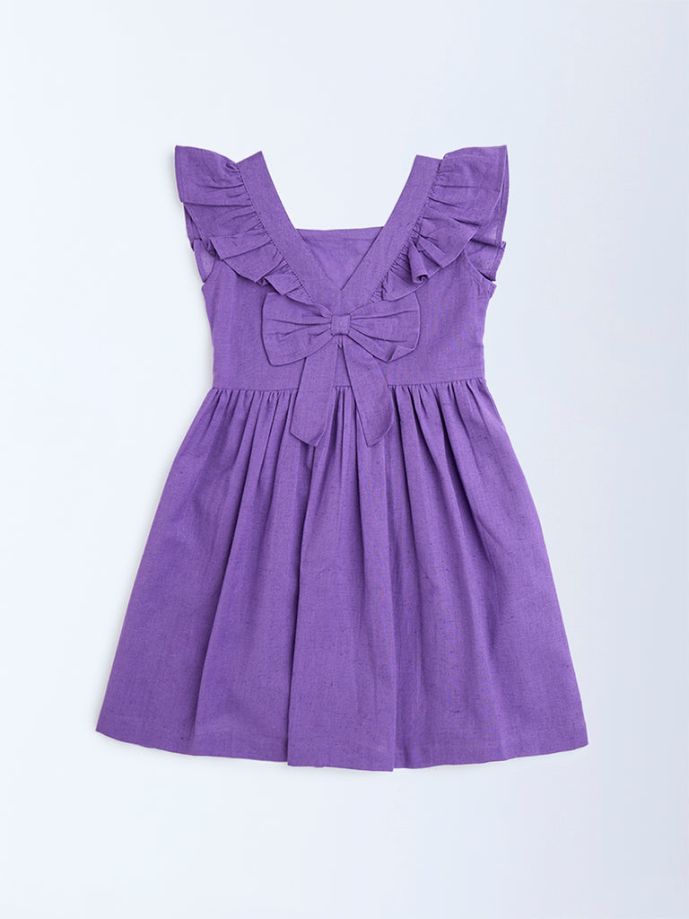 A blend of comfort and festive flair. this purple dress from Utsa Kids is crafted from a lightweight cotton-blend fabric for easy. all-day wear. The embroidered yoke adds a vibrant touch. while the square neckline. ruffled sleeves. and bow at the back lend a charming finish. The A-line silhouette makes it a versatile pick for celebrations or casual days out.