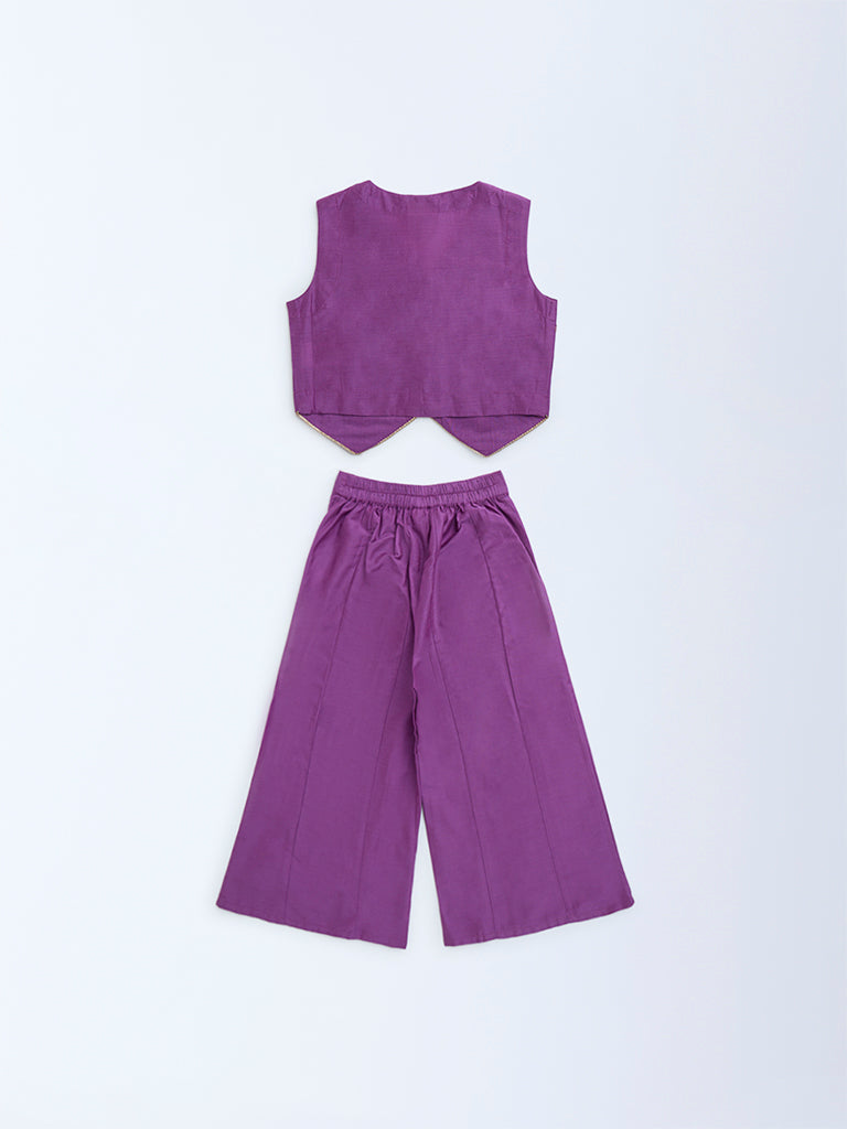 Utsa Kids introduces this charming purple two-piece set. perfect for little celebrations. The V-neck top is beautifully decorated with floral embroidery and sparkling sequin embellishments. Paired with breezy palazzos featuring an elasticated waistband. this outfit blends festive elegance with fuss-free wear.