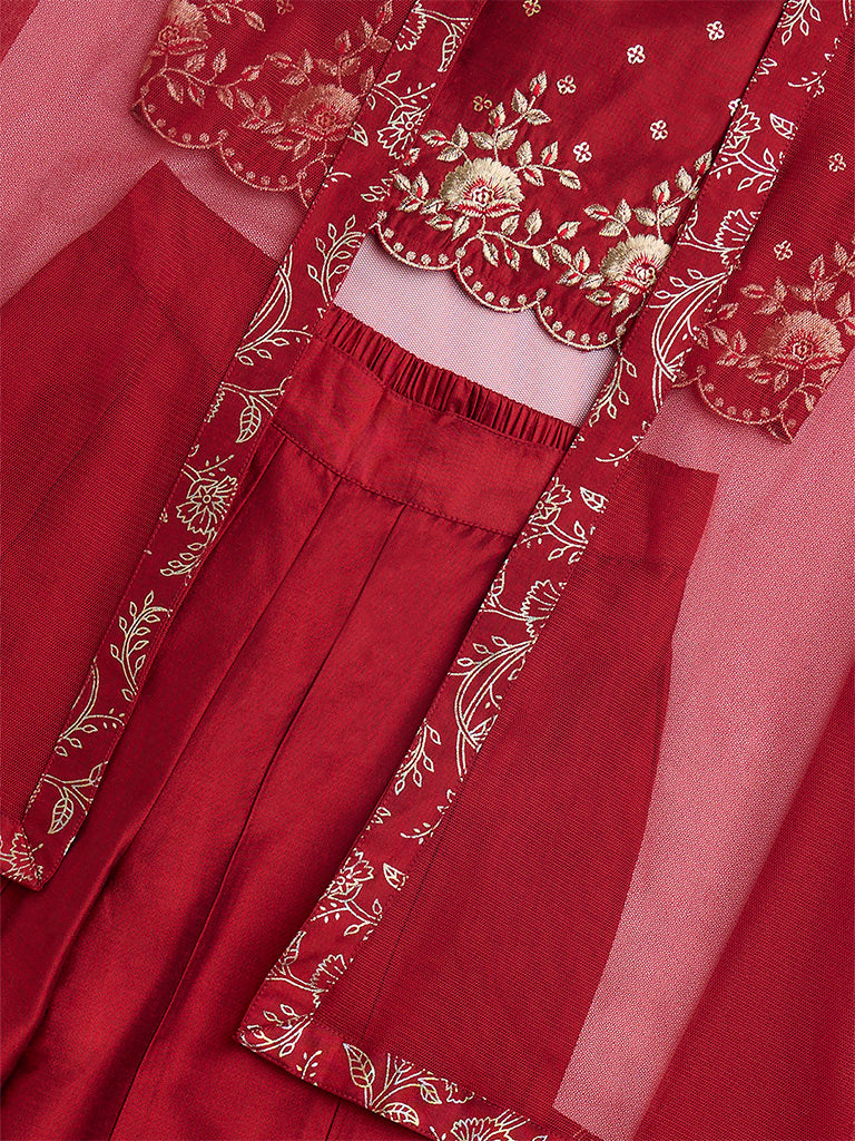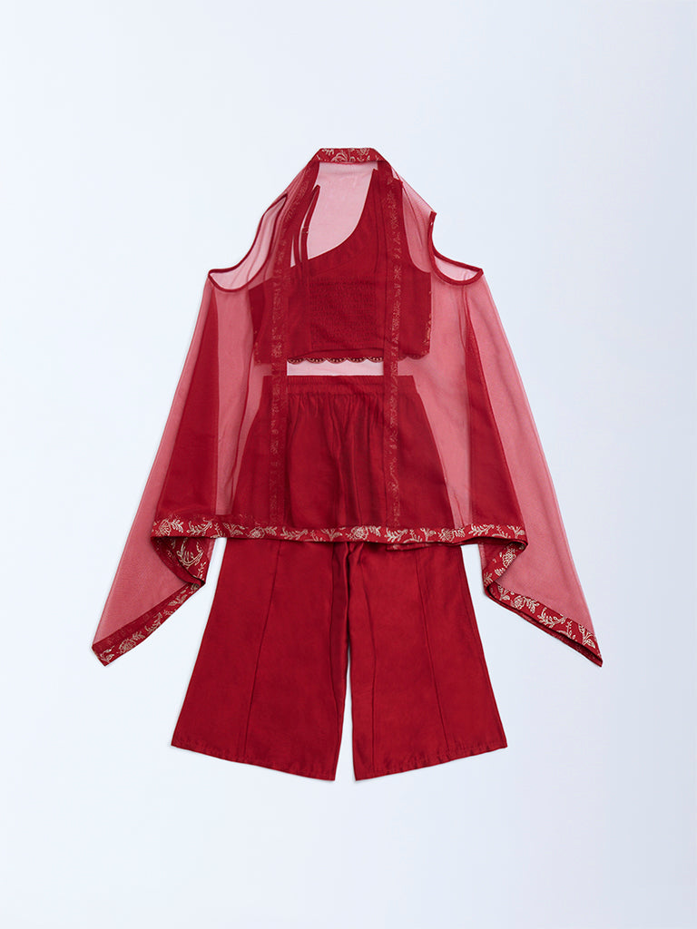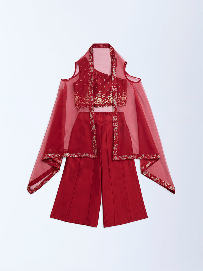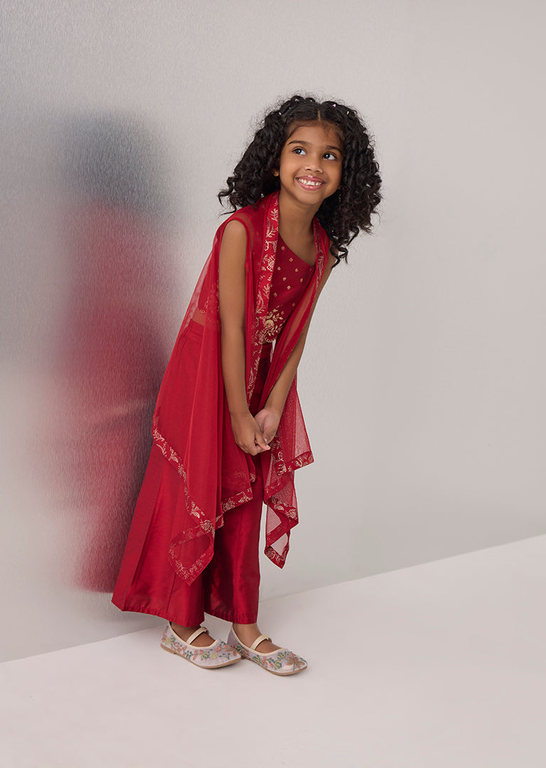 This red ensemble by Utsa Kids carries little ones through occasions with poise and charm. The one-shoulder top is adorned with intricate floral embroidery on the front. while a smocked back ensures a comfortable fit. Wide-leg pants with an elasticated waist offer ease of movement. and a delicate net shrug. finished with embroidered borders. adds a layer of regality.