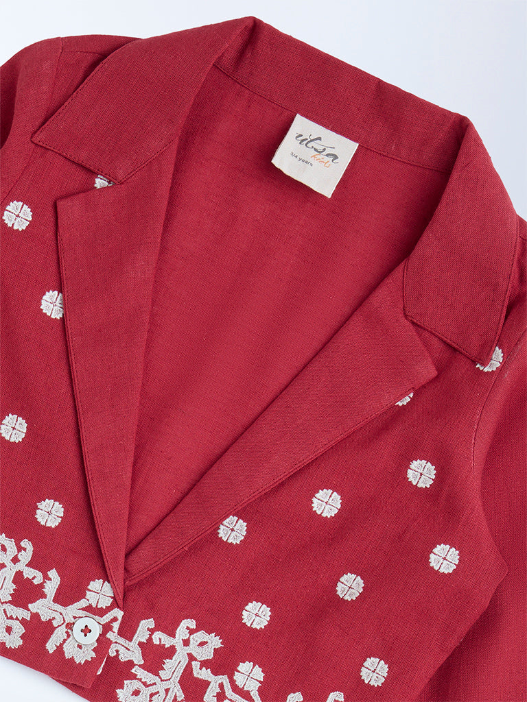 Utsa Kids presents this red jacket featuring Jamdani embroidery for a traditional yet stylish look. Designed with a notch lapel. a single-button closure and full sleeves. it blends comfort with elegance. Crafted from a soft cotton-blend fabric. this lightweight layer is perfect for festive outings and special occasions.