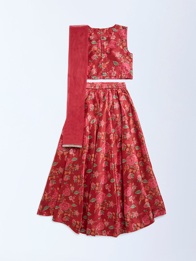 Let her revel in festive opulence with this rust ethnic set from Utsa Kids. tailored from a premium fabric that promises all-day comfort. Adorned with a floral pattern and sequin-detailed V-neck. the choli flaunts a tie-up detail at the front for a secure fit. The matching ghagra comes with an elasticated waistband to keep movement easy. while a net dupatta edged in zari completes the look with graceful charm.