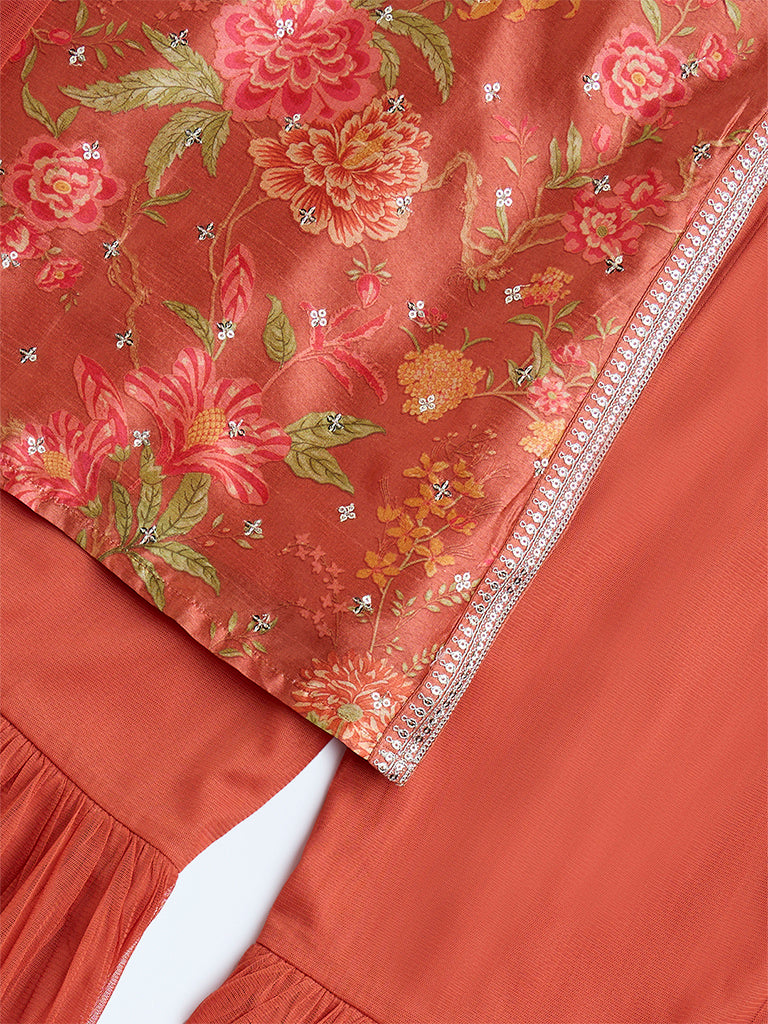 Bring festive flair to their wardrobe with this rust ethnic set from Utsa Kids. Featuring a V-neck kurta with vibrant floral patterns and delicate sequin embellishments. the ensemble is paired with matching shararas fitted with an elasticated waist for all-day comfort. A sheer net dupatta with exquisite zari trim completes the look. lending a regal touch for special occasions.