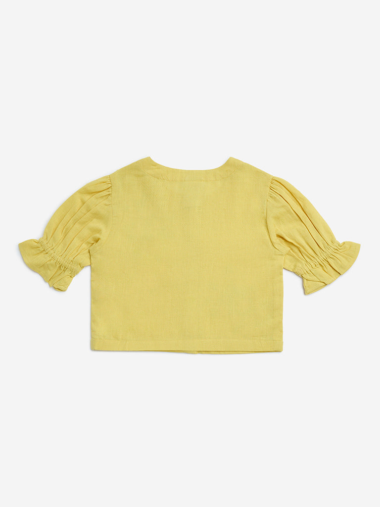 Brighten up your child’s wardrobe with this cheerful yellow ethnic top from Utsa Kids. adorned with vibrant floral embroidery for a playful yet refined look. Spun from a sumptuous cotton-linen blend. it features a round neck and puff sleeves that lend a touch of elegance to its airy silhouette.