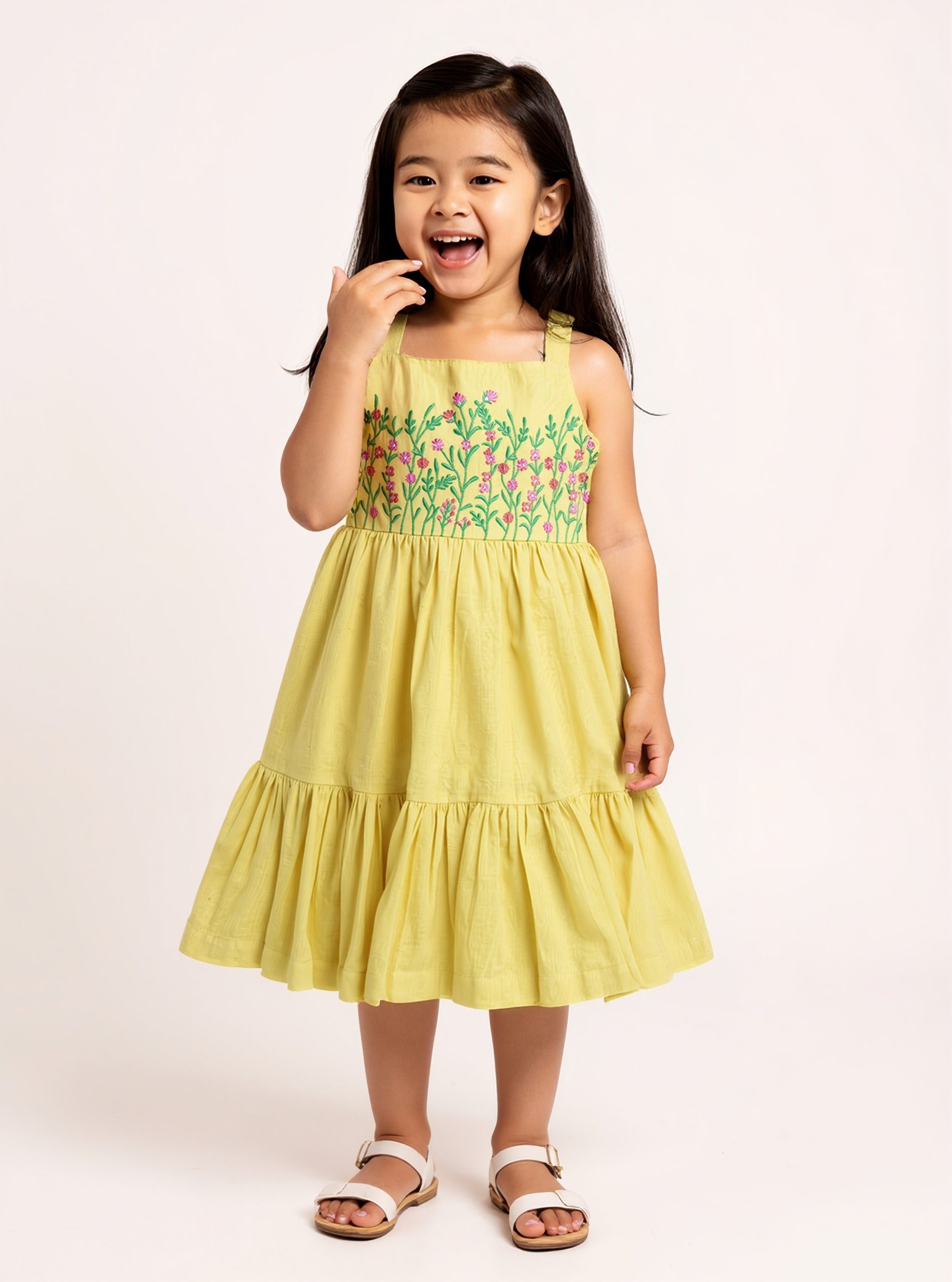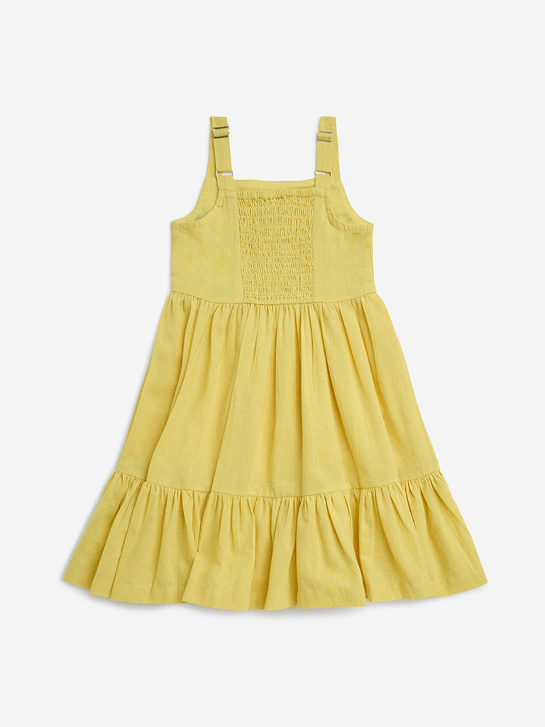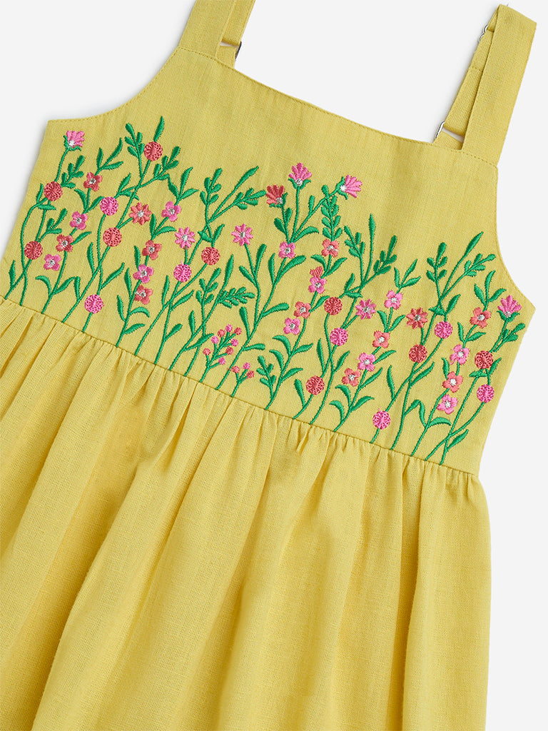 This yellow dress from Utsa Kids is a sunny-day favourite. detailed with graceful floral embroidery on the bodice for a handcrafted touch. Cut from a soft cotton-blend fabric in a breezy tiered silhouette. it features a square neckline. adjustable shoulder straps. and a smocked back for all-day comfort.