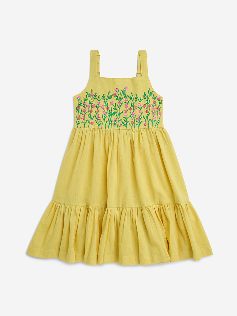 Utsa Kids Yellow Floral Embroidered Cotton-Blend Tiered Dress – (2-8yrs)