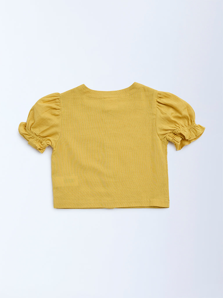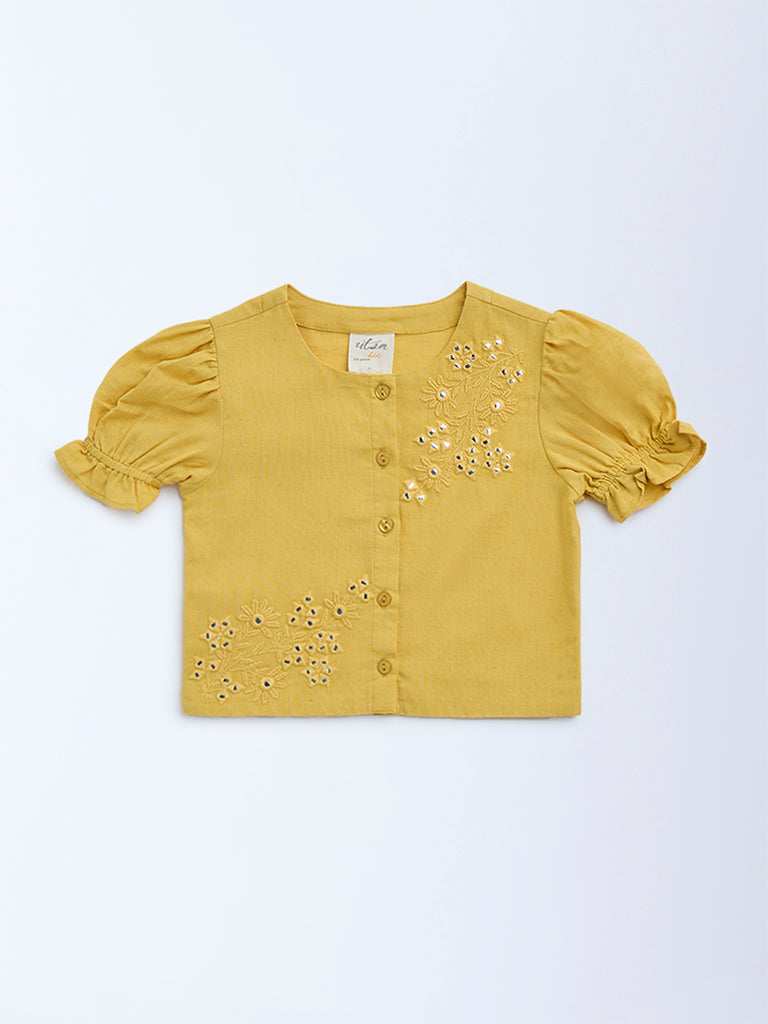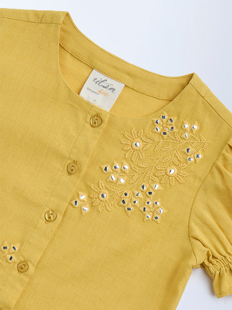 A festive favourite in the making. this yellow ethnic top from Utsa Kids is crafted in soft cotton for easy comfort. Intricate floral embroidery enhanced with mirror work lends a celebratory sparkle. while the round neck and puff sleeves bring in a hint of vintage-inspired elegance.