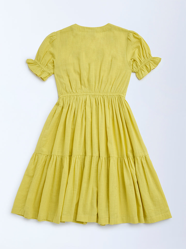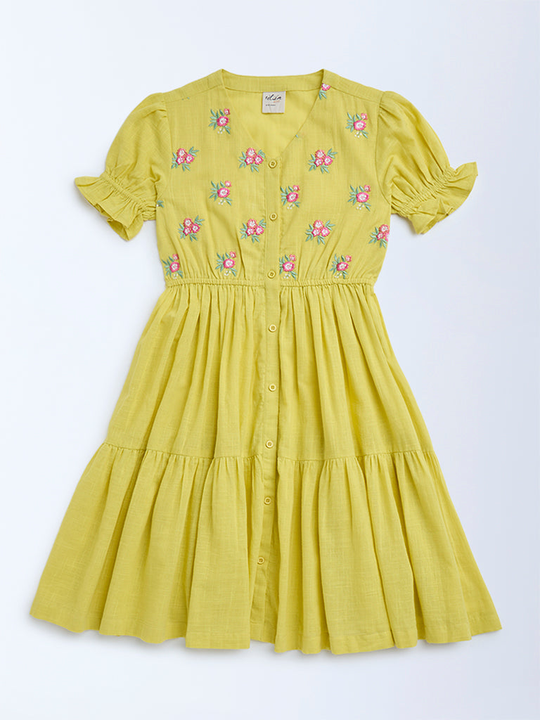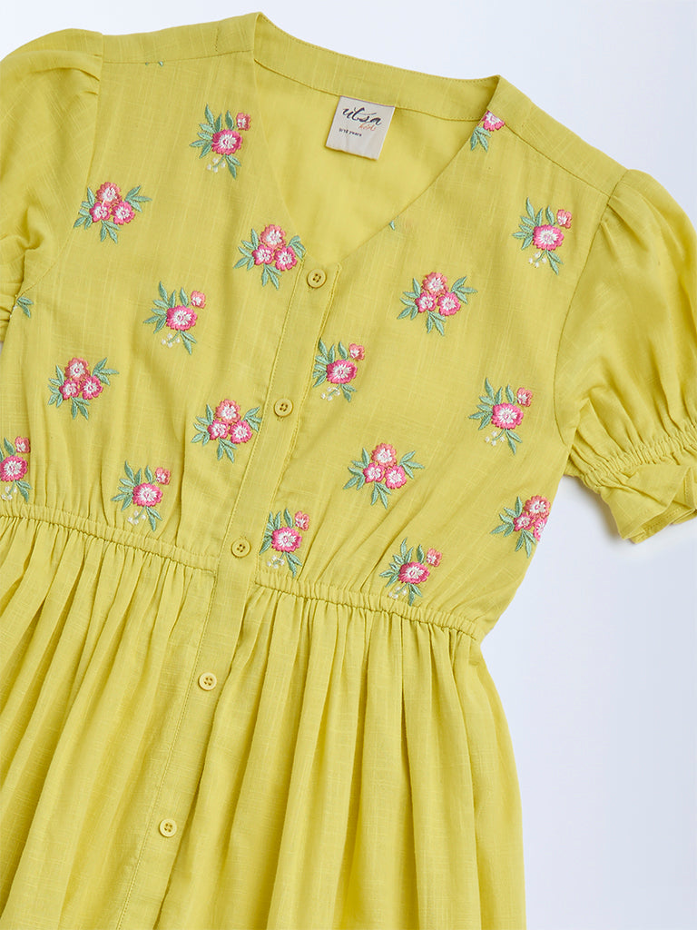 Utsa Kids Yellow Floral Embroidered Cotton Tiered Dress – (8-14yrs)