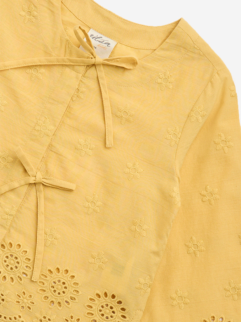 Utsa Kids brings you this yellow top featuring floral embroidery and cut-out detailing. The pure cotton ethnic wear boasts knot-detailing including a round neck and full sleeves.