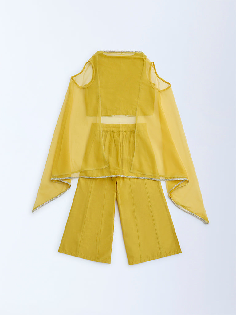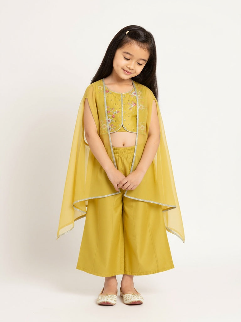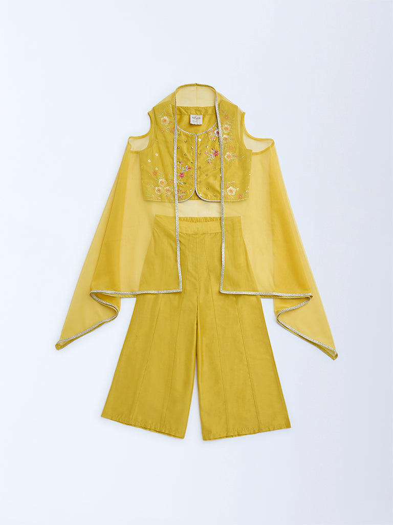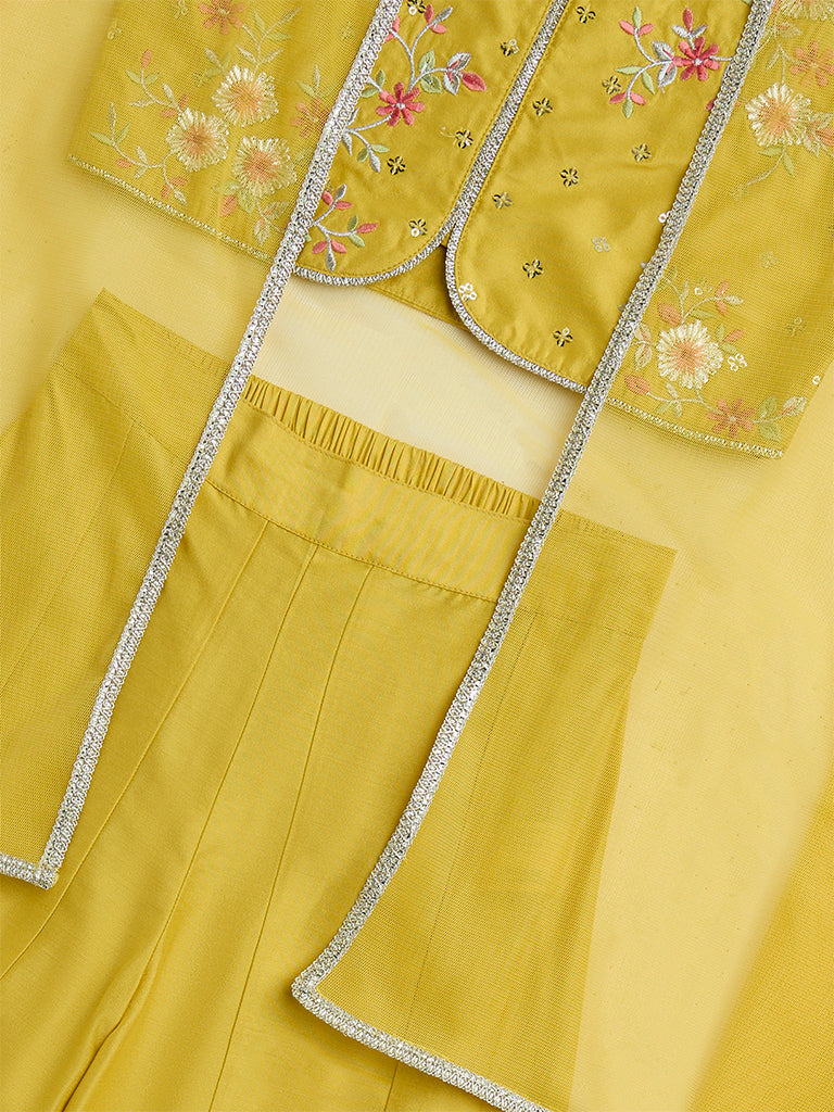 Add a sparkle of festivity to her wardrobe with this yellow three-piece set from Utsa Kids. The round neck top is fashioned with floral embroidery and paired with solid palazzos featuring a smooth elastic waistband for comfort through the day. The ensemble is complete with a sheer net shrug that is beautifully accented with silver-toned zari embroidery.
