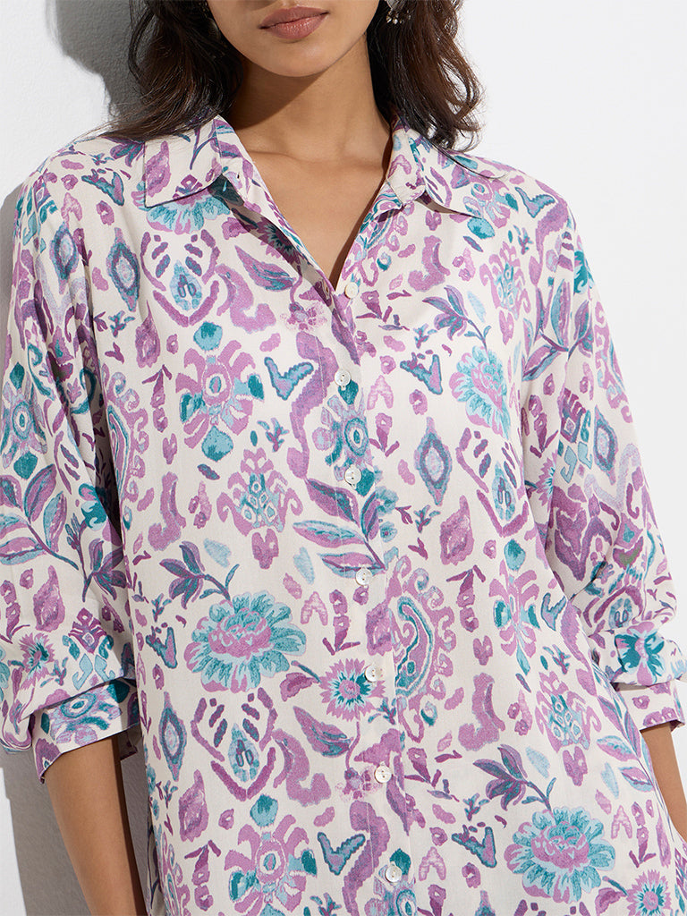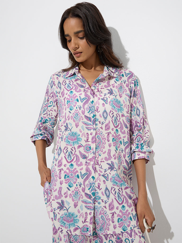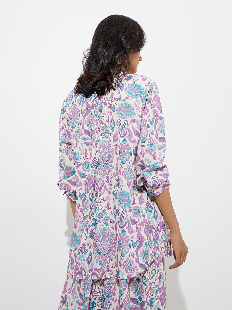 Utsa lends a graceful update to everyday ethnic wear with this lilac tunic adorned in traditional-inspired motifs. Spun from a lightweight fabric. this piece is tailored with a structured collar. a button-down placket. and full sleeves.