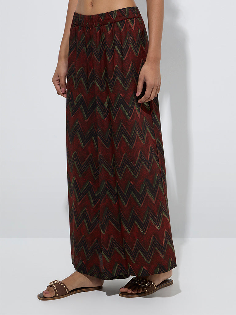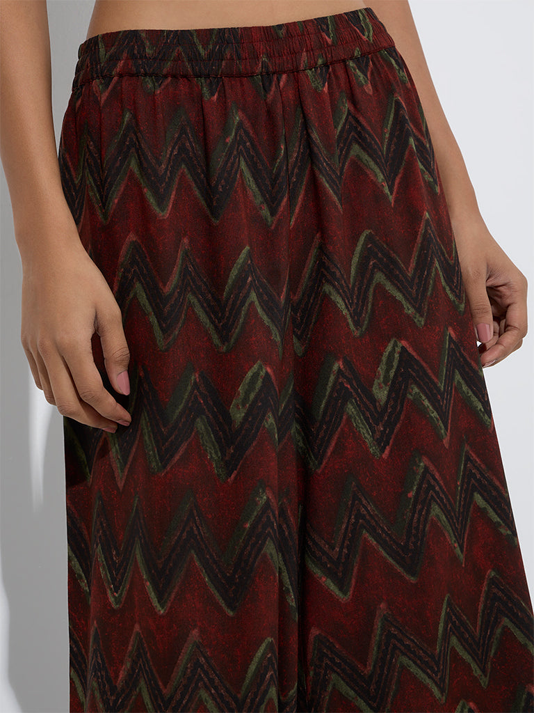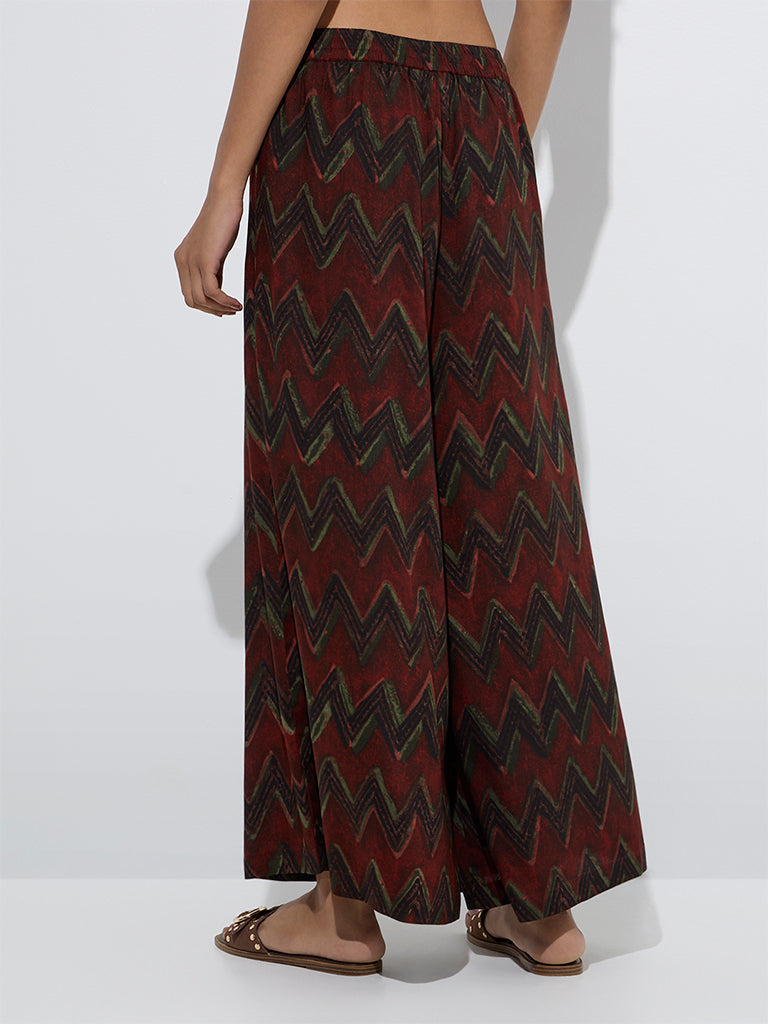 These maroon palazzos from Utsa showcase chevron detailing that adds depth to their rich hue. Crafted from a breathable fabric. they feature an elasticated waistband for a comfortable and flattering fit all day long.