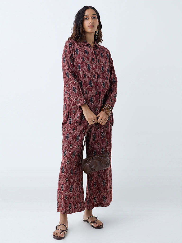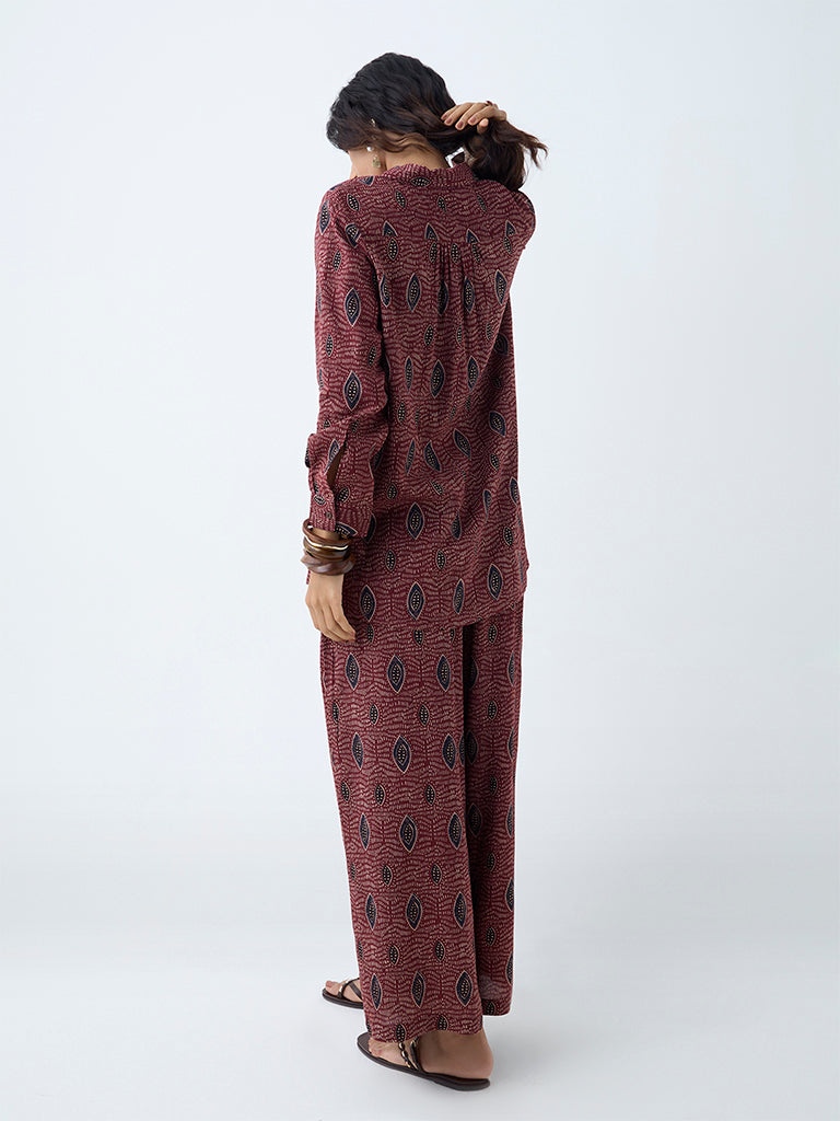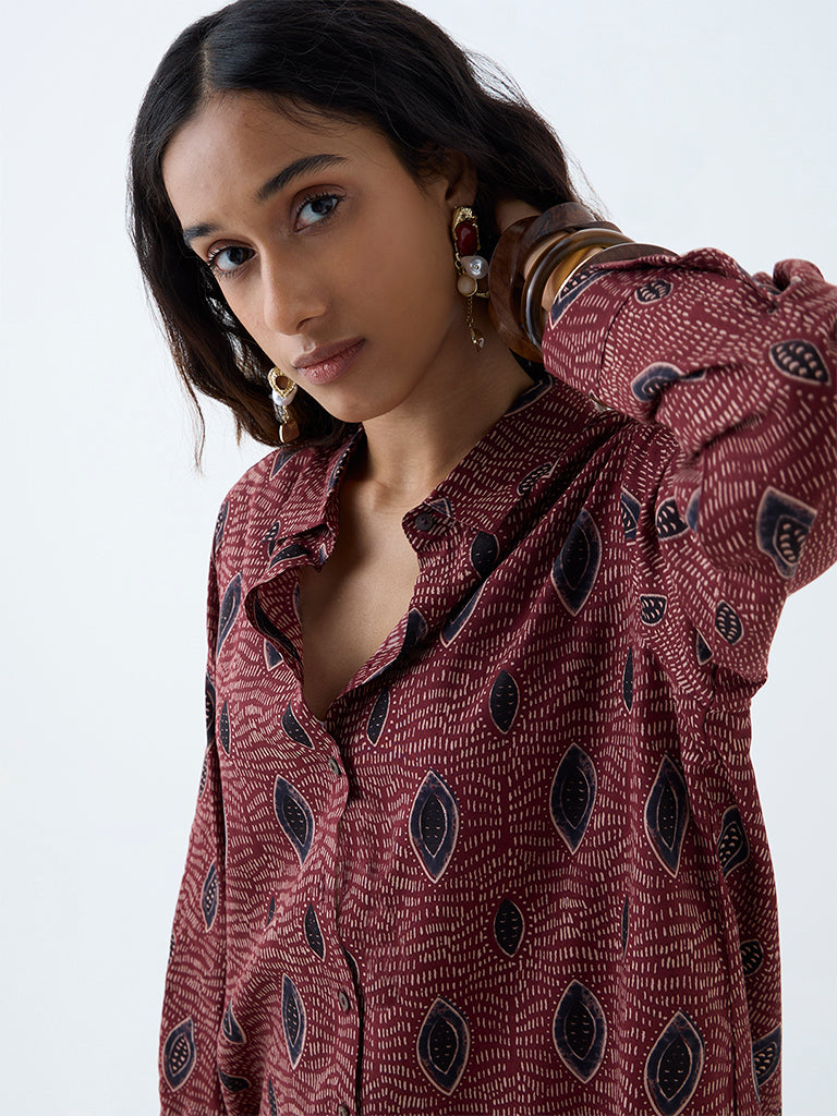This maroon ethnic tunic from Utsa showcases a striking eye-print that lends it a contemporary finesse. Tailored from quality fabric. it features a spread collar. full sleeves. and a button placket for a refined finish.