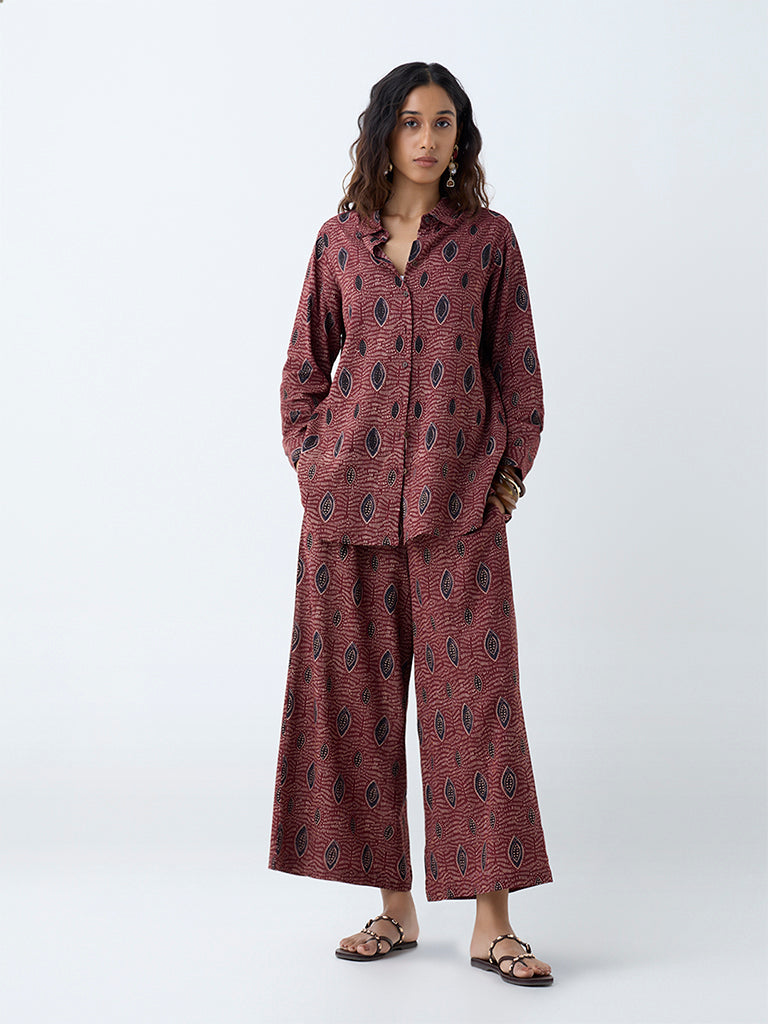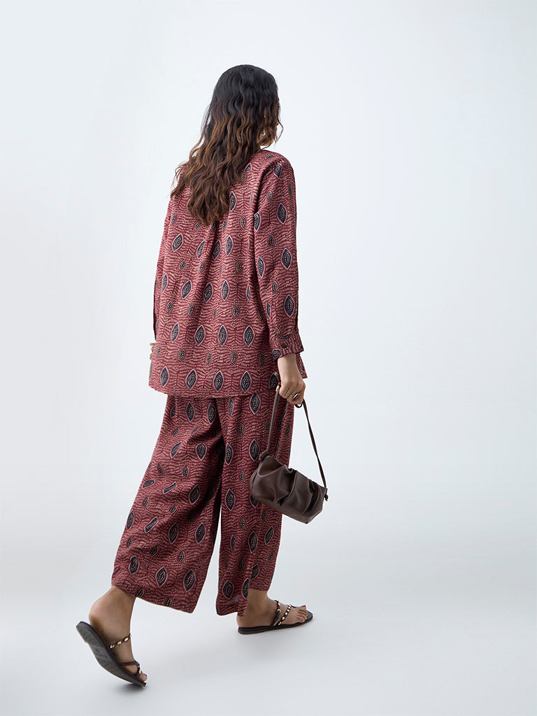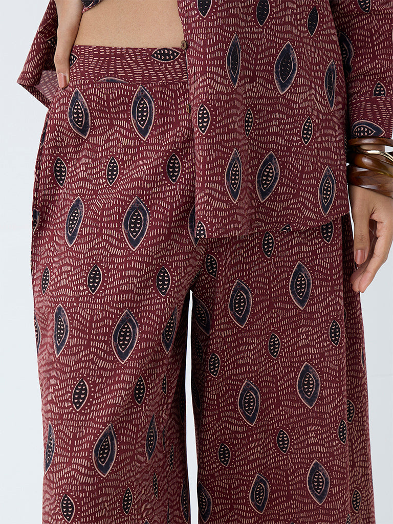 These maroon palazzos from Utsa bring a quirky twist to ethnic dressing with their bold eye-print. Cut from a breathable fabric. this easy-going pair features a smooth elasticated waistband and handy side pockets.