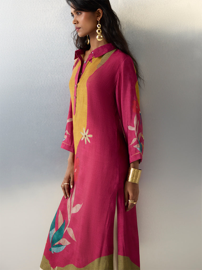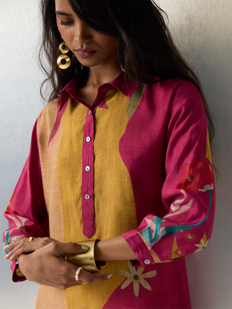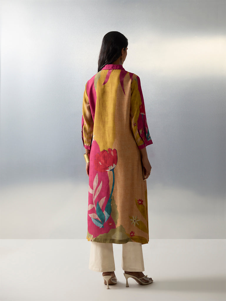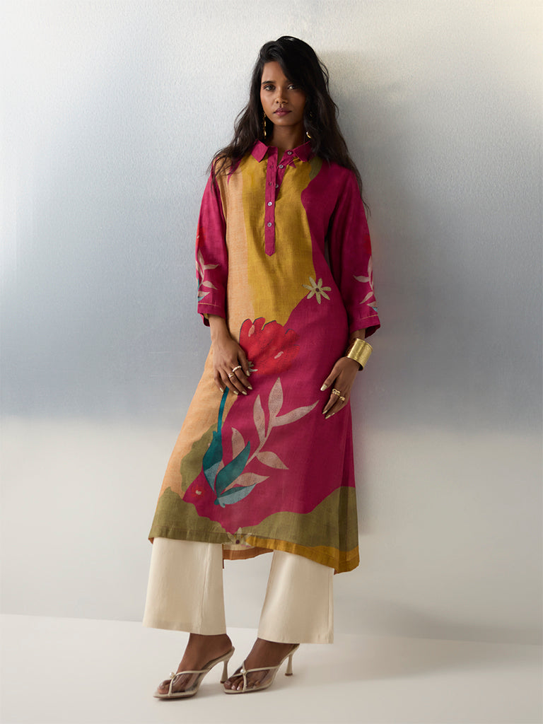 Utsa introduces this multicolour kurta structured in an A-line shape from a breathable fabric build. It is styled with a shirt collar. a brief button placket and three-quarter sleeves for a structured finish. Exhibiting bold floral motifs. this is a vibrant selection for festive gatherings and everyday ethnic wear.