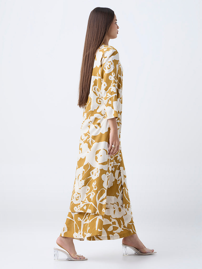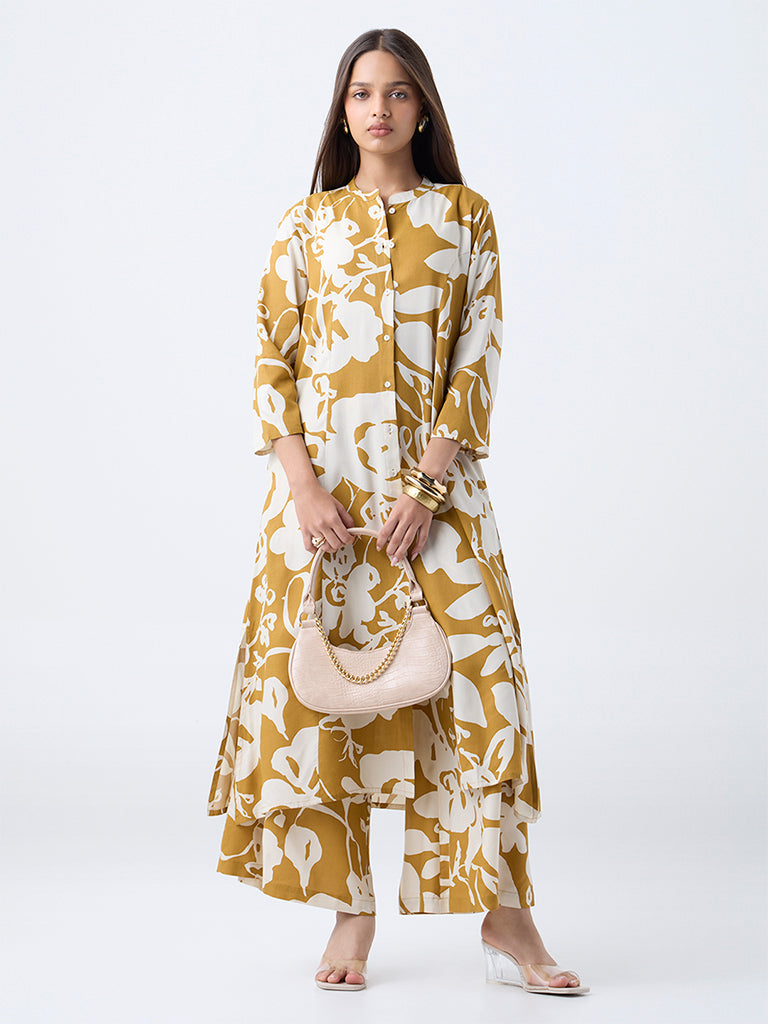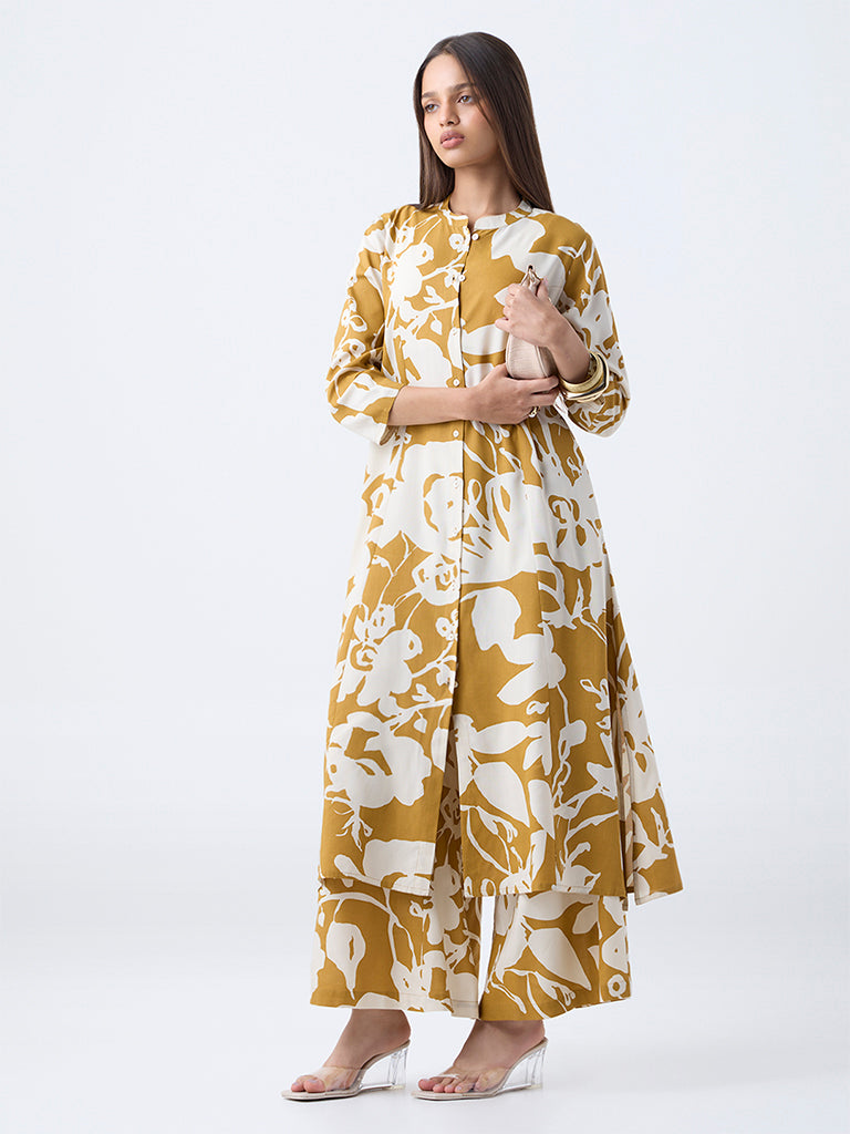 Utsa Mustard Botanical Pattern A-Line Kurta